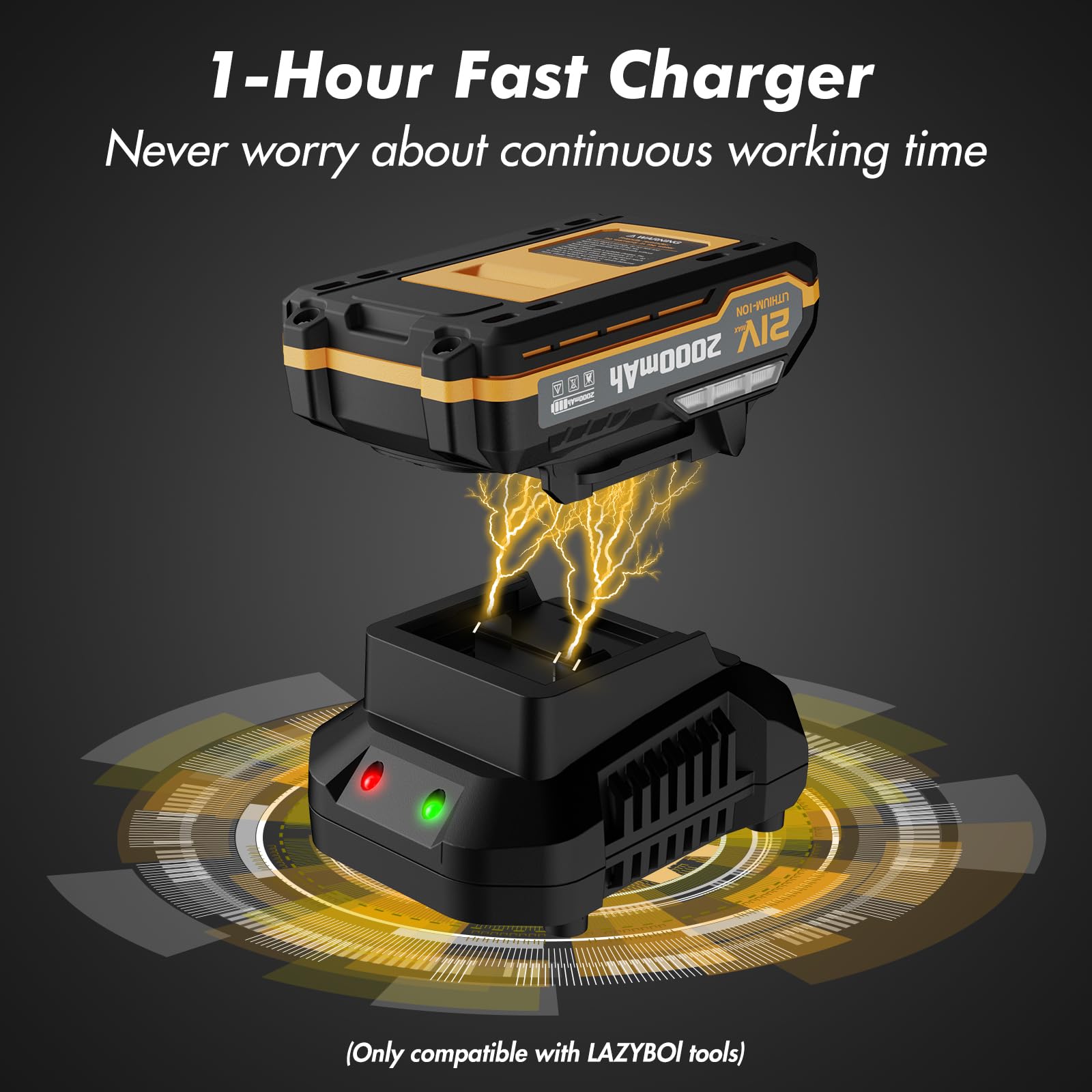 - [Effortless Charging and Operation] Fed up with lengthy battery charging times? Experience the convenience of rapid 1-hour charging with our cordless leaf blower. Its LED indicator signals red during charging and green when fully charged. Equipped with a fast charger and two 2.0Ah 21V batteries, it provides 20 minutes of continuous operation (10 minutes per battery fully charged working time), making your work easier