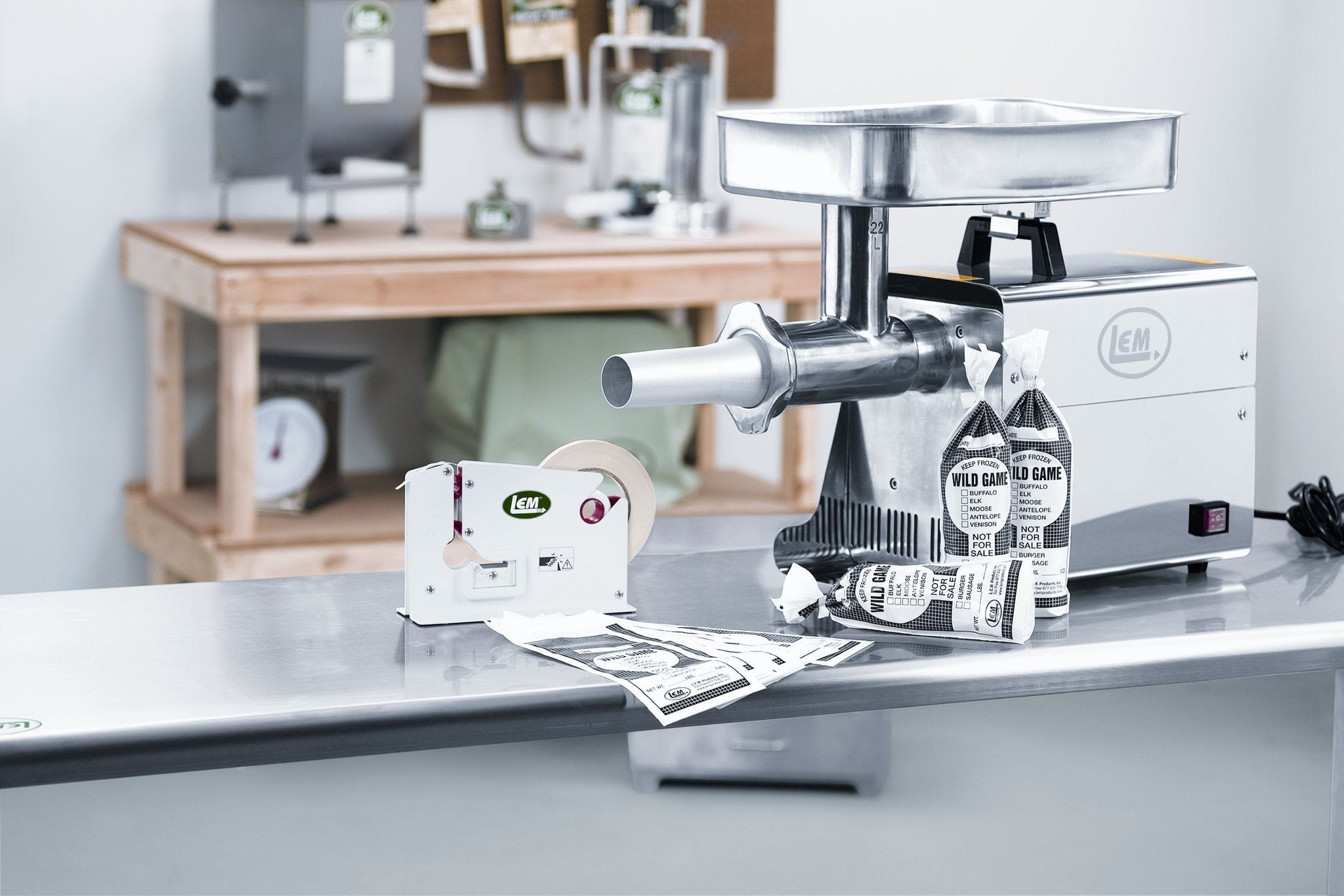LEM Products 200 Ground Meat Packaging System: Here's everything you need to package your ground meats, and more, in 1/3 the time it takes to freezer wrap it. The Ground Meat Packaging Kit contains the bag taping machine, 1 roll of poly bag tape and 50 - 1 pound wild game bags. Add a 2" stuffing tube (not included) over the plate of your grinder for the second grind. Slide a bag on the stuffing tube, grind meat directly into bag. Squeeze air out, twist bag and seal with taping machine. Directions included. LEM Products makes home meat processing easy! We deliver high quality meat processing equipment: meat grinders, jerky making equipment, and vacuum sealers along with the needed supplies for the hunter and home meat processor. Our products allow everyone from butchers, restaurants, and the at-home meat processor to make delicious sausage, jerky and other meat products, all while controlling the healthy content of the foods they provide for their family and friends. LEM is the leader in game processing. We research what our consumers need and translate that into products that help hunters save time and money by turning their hard-earned game into the purest organic meat that can be found. All of our LEM products and Backwoods seasonings have been customized and crafted with the home game processor in mind. Our meat grinders and sausage stuffers are used by hunters and restaurants alike. Our vacuum sealers are powerful enough to handle the continuous sealing that fishermen often need. Our dehydrators and slicers are built for meat processors who love making jerky and deli-thin meat. Whether you need a meat grinder, sausage stuffing machine, dehydrator, deli meat slicer, freezer storage solutions, food storage, casings, or seasoning, we will deliver it in a high-quality way. Our goal is to deliver high quality products that make food preparation easy and fun. We will support our customers with end-to-end service and guaranteed satisfaction. We believe home processing to be an essential part of the outdoor experience and will continue to promote the responsible use of our greatest gift, the bountiful outdoors