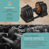 - LIFT FROM 2 TO 43 LBS WITH ONE SYSTEM - The adjustable barbell, kettlebell, & dumbbells feature a simple-to-use weight set adjustable turndial, allowing you to go from 2 to 43 lbs in small increments.