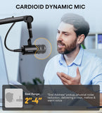 - ALL IN ONE MIC SET: XLR dynamic microphone with desktop stand * 1, mic rod extender* 1, heavy round metal base * 1, 6.56 ft XLR cable * 1,user manual * 1. Start your broadcast journey with a premium and affordable microphone set here