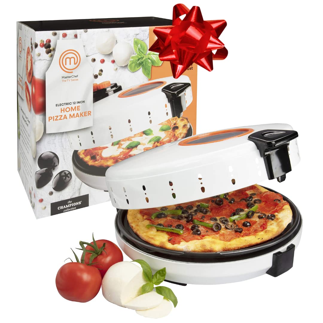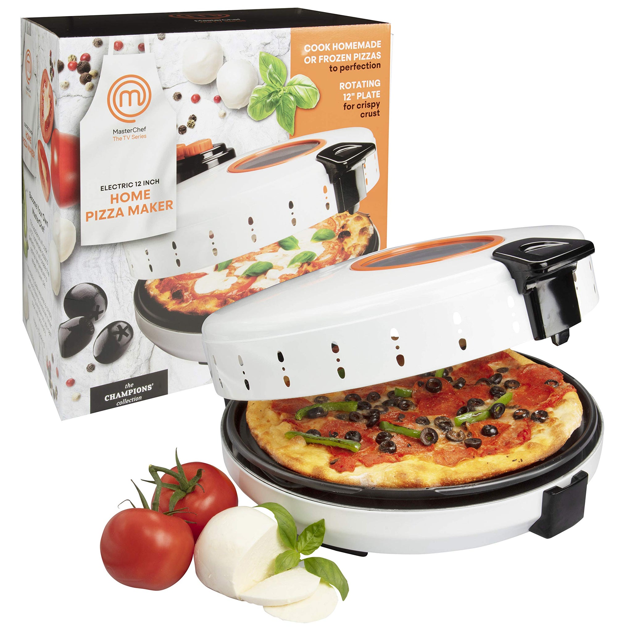 Details: MasterChef Pizza Maker- Electric Rotating 12 Inch Non-stick Calzone Cooker - Countertop Pizza Pie and Quesadilla Oven w Adjustable Temperature Control: The MasterChef Pizza Maker is the perfect countertop pizza oven and can make so much more! Use it to cook quesadillas or nachos, or bake cinnamon buns, giant cookies and more! With the viewing window you will always be able to see how your creation is coming along and can use one of the three temperature adjusts to cook your food perfectly. Clean up is a breeze with the removable non-stick cooking stones.