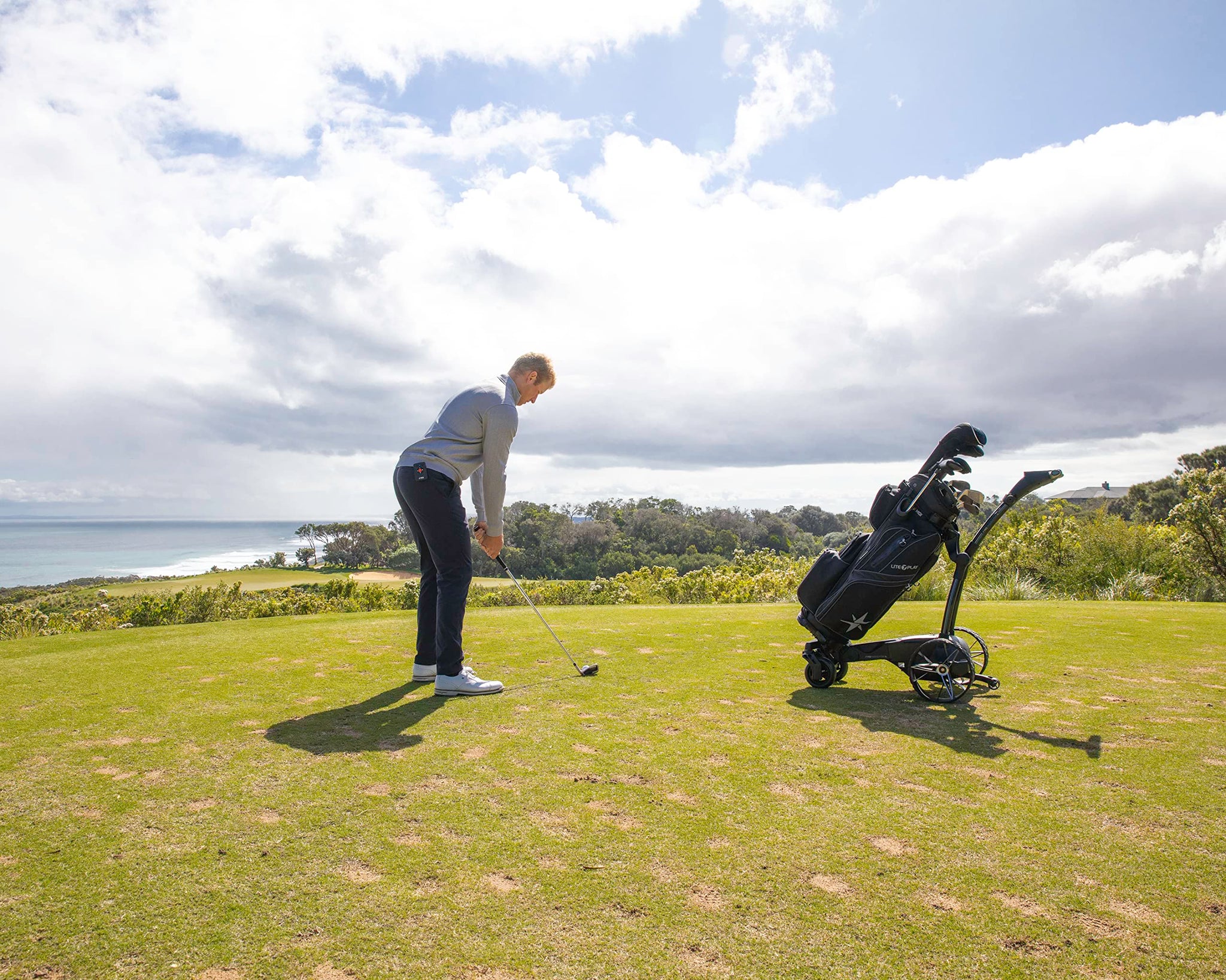 • Single Action Zip Fold Technology-Innovative & compact one piece frame engineered zip fold system will make setup easy and quick to and from the course. Newly Engineered Single Action Zip Fold System for easy transport and space savings to and from the course. The rear wheels can be inverted on the axle to reduce the size of the footprint when not in use. Folded Dimensions (Inverted Rear Wheels); 24.40 X 18.11 x 15.35 Inches. Weight (No Battery) 33.28 LBS (With Battery: 38.99 LBS)