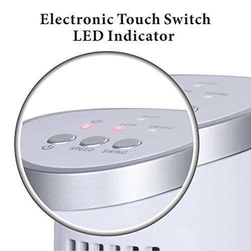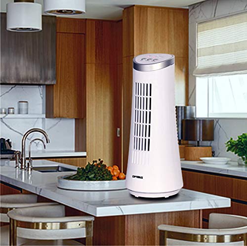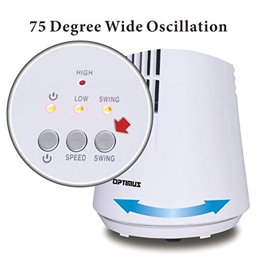 Details: Cool off at your desk with the 12-in. Desktop Ultraslim Oscillating Tower Fan from Optimus, in white. This desktop fan features 75deg oscillation to cool your area. The convenient handle and portable design lets you move the desktop fan around the home or office, where you need the breeze the best.