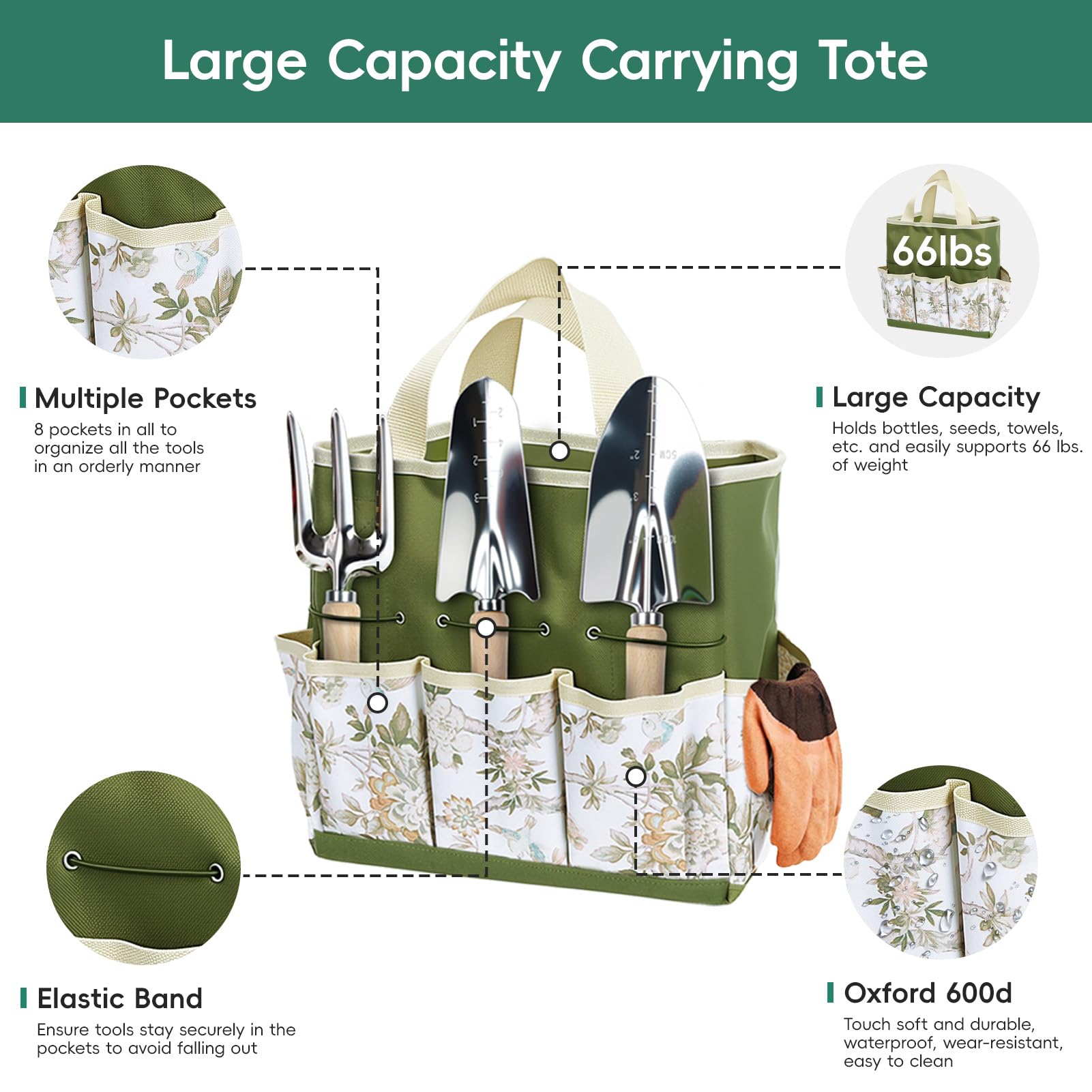 - Premium Gardening Tote: The gardening set comes with a practical tote bag, the outer fabric is 600D Oxford, touch soft and waterproof wear-resistant and easy to clean, the bag is designed with 8 pockets in all to properly store all the tools, and with elastic band to ensure all tools not fall off!