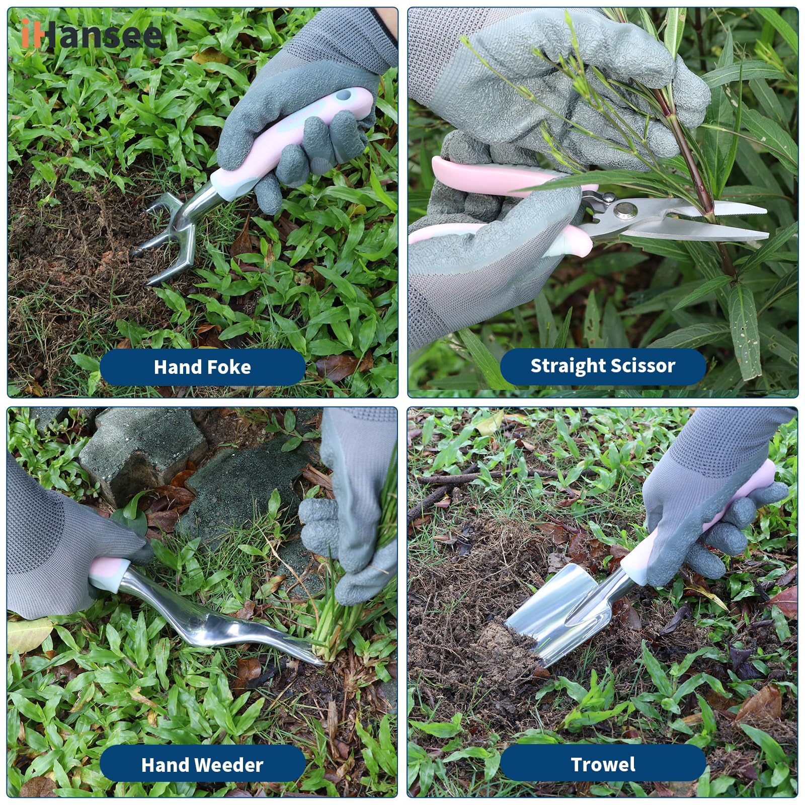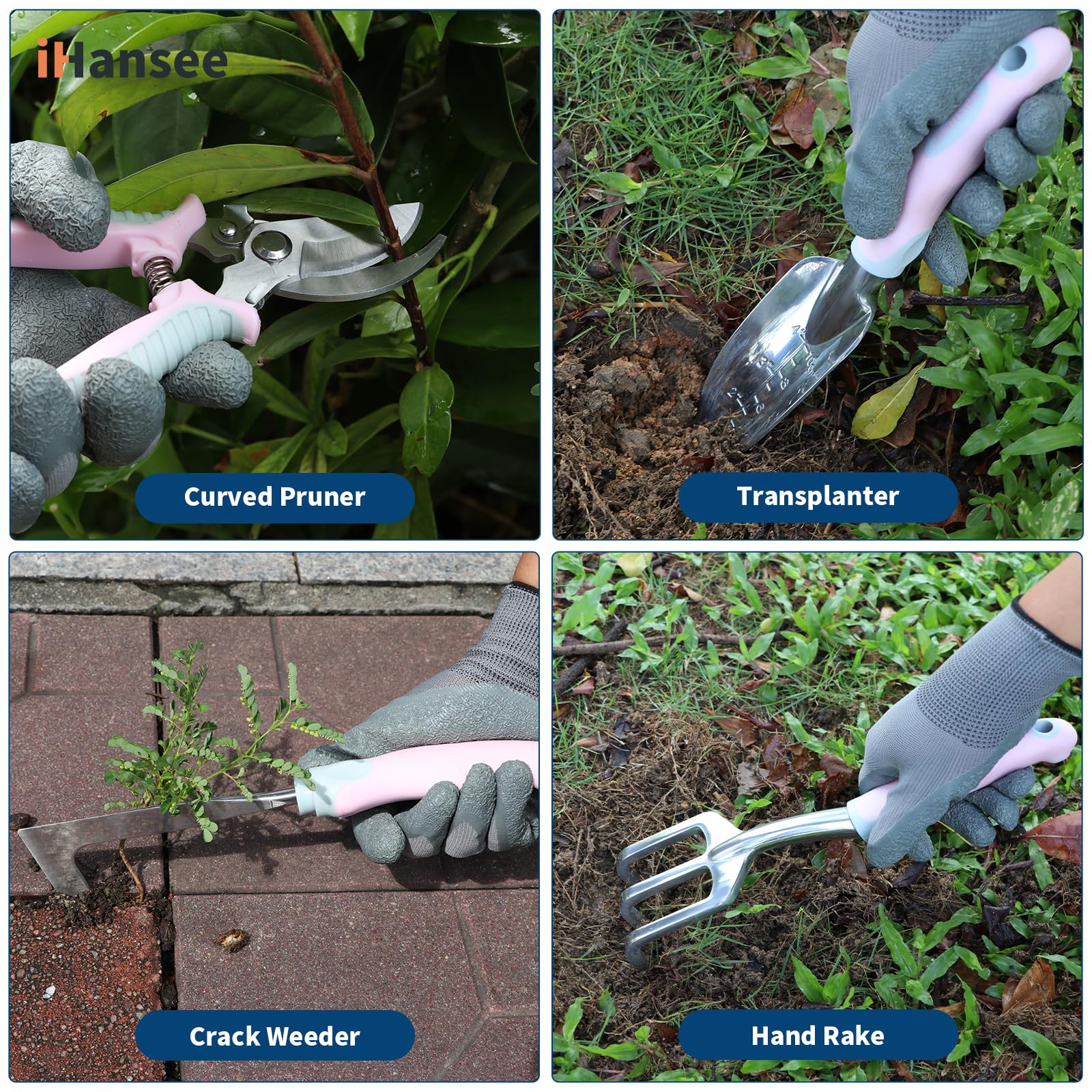 - Durable and Rust-Resistant Tools: Crafted from aluminum alloy, iHansee gardening tools are lightweight yet strong, offering long-lasting durability and rust resistance. Each tool has an ergonomic concave-convex handle made of PP+TPR for a comfortable grip. Designed to reduce strain on wrists and hands, the handles provide excellent leverage for digging, planting, and weeding.