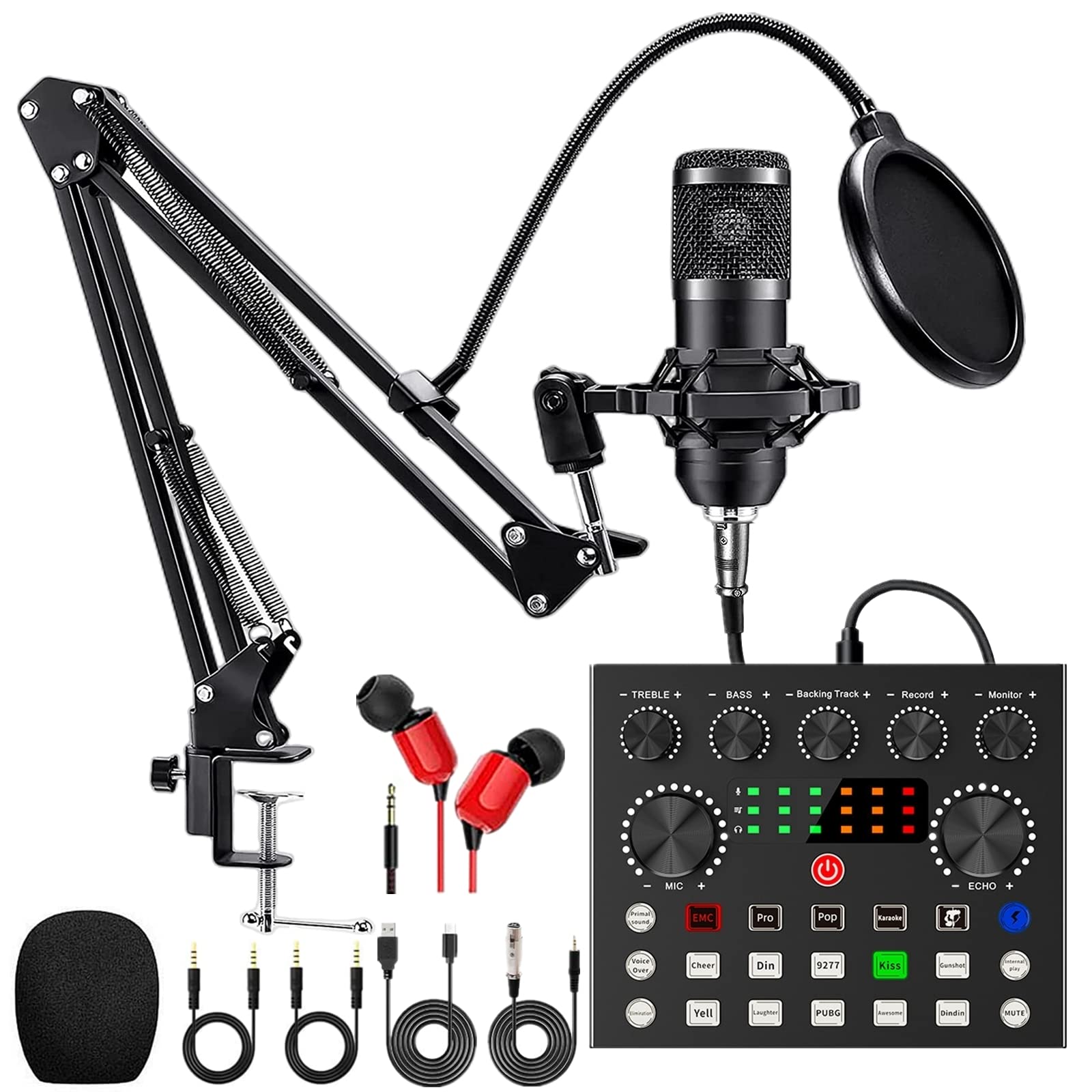 - š„ćProfessional Podcast Equipment Bundleć- The Podcast Equipment Bundle is equipped with BM-800 microphone, V8S sound card, Shock mount, Pop filter, Mic adjustable suspension scissor arm stand, Anti-wind foam Cap, Power cable. This professional studio equipment was designed for podcasting, streaming and recording music and short video. What you get is a complete set of professional podcast equipment bundle. One set can meet all your needs and you donāt need to buy other equipment again.