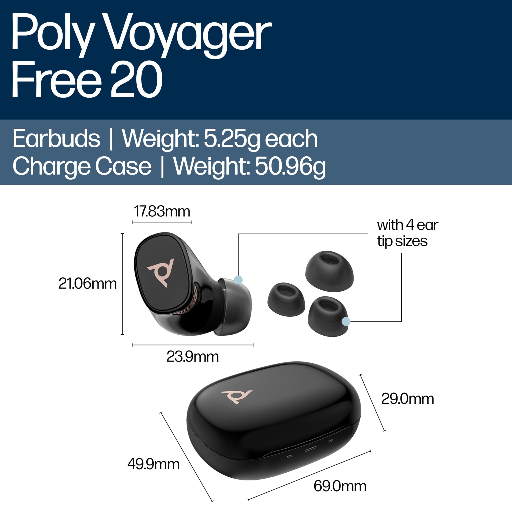 Details: Experience the simplicity of a true wireless earbud that powers your day. Adaptive ANC keeps you focused while Poly legendary audio makes your music and calls sound great. And personalized all-day comfort keeps you feeling good. 1. Poly Voyager Free 20 is powered by the Qualcomm S3 Gen 2 Sound Platform with on-device AI to enhance the overall user experience.