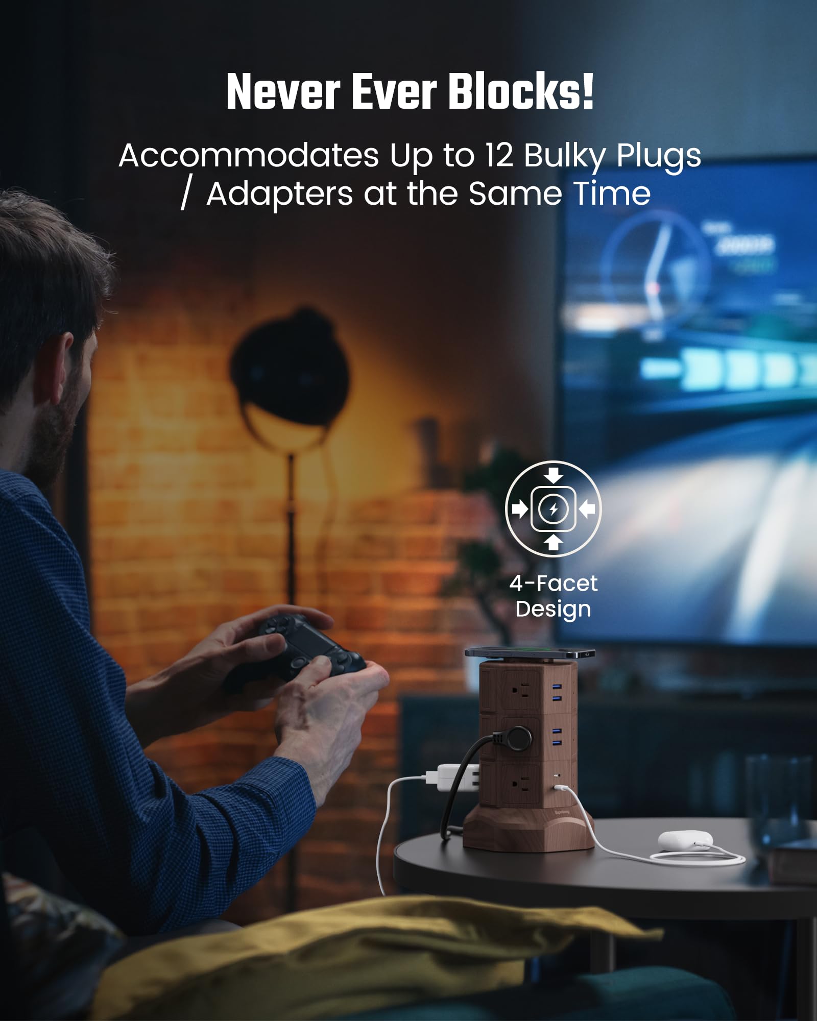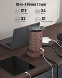 - ⚡【Powerful and Efficient】The small footprint power tower allocates 12 AC outlets, 4 USB-A (2.4A Max), and 2 USB-C ports (3A Max) on 4 facets vertically, perfect for large bulky plugs or adapters and multiple uses at the same time; With independent switch on each layer, all devices connected to this power strip with USB C ports can be managed by one push efficiently with no energy wasted; 5V/4.8A shared by 6 USB ports, 0-2.4A each.