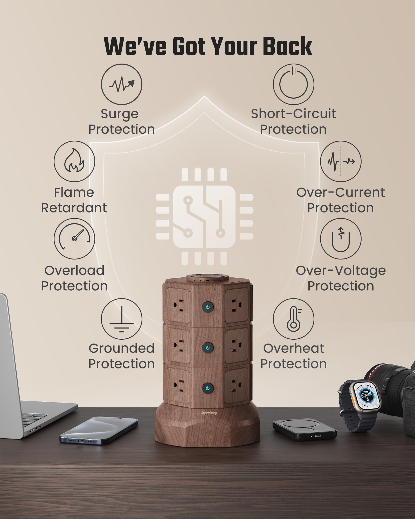 - ⚡【World-Wide Use & Surge Protector】This power strip surge protector tower (rated current 13A) is designed with dual voltages: 110V~240V, which made it compatible with multiple devices with right adapters through out the world; 1050J surge protection joules is armed to keep your devices away from surge hazard.