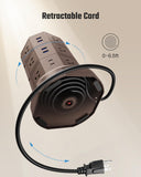- ⚡【Space Saving and Retractable】The small footprint power tower manages its 6.5ft power cord by rolling the main body, combined with vertical tower design with a small footprint base to offer you a self-adjusting reach to the wall outlet but covers zero extra space, keeping your desk clean and tidy.
