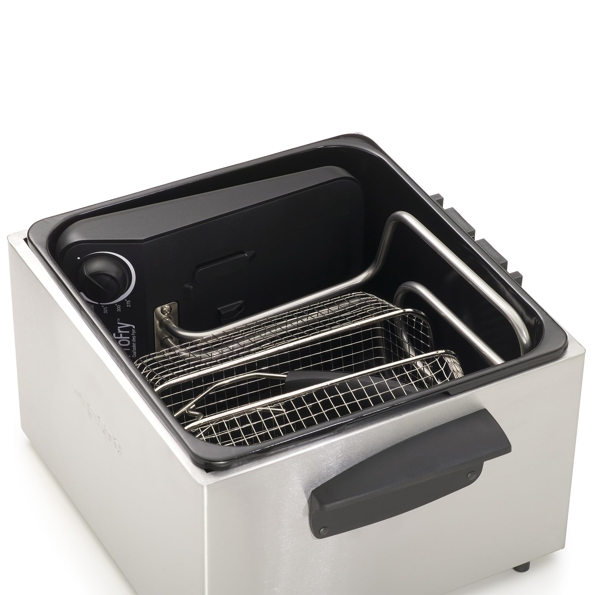 Details: Professional-style deep fryer with dual baskets. Offers great restaurant taste in a convenient at-home size. Big 12-cup food capacity for frying family-size quantities in a hurry. Oblong-shaped baskets are ideal for large pieces of chicken or fish. 1800-watt immersion element provides quick preheating and fast oil temperature recovery. Adjustable thermostat for easy selection of a variety of frying temperatures. Signal light lets you know when the oil is ready for frying. Cover with charcoal air filter helps reduce spattering and odor. Heating element and enameled pot are removable for easy cleaning. One year limited warranty. The maximum amount of oil for this fryer is 5 quarts and the minimum amount is 3½ quarts.