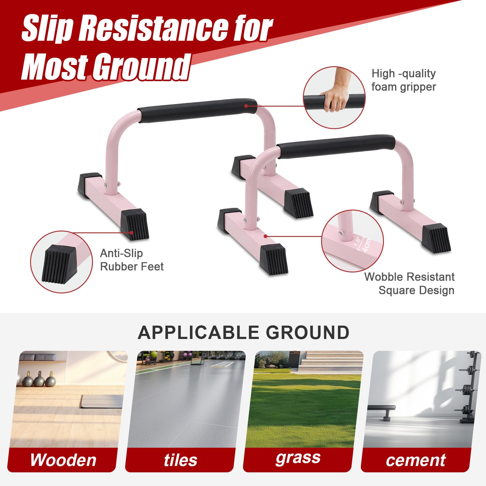 - Anti-slip & Sweat-resistant for Safety: The handstand bars are equipped with thickened and enlarged anti-slip feet, which help to ensure stability and prevent scratching on the floor. And its foam handle avoid sweat than ensures safe exercise