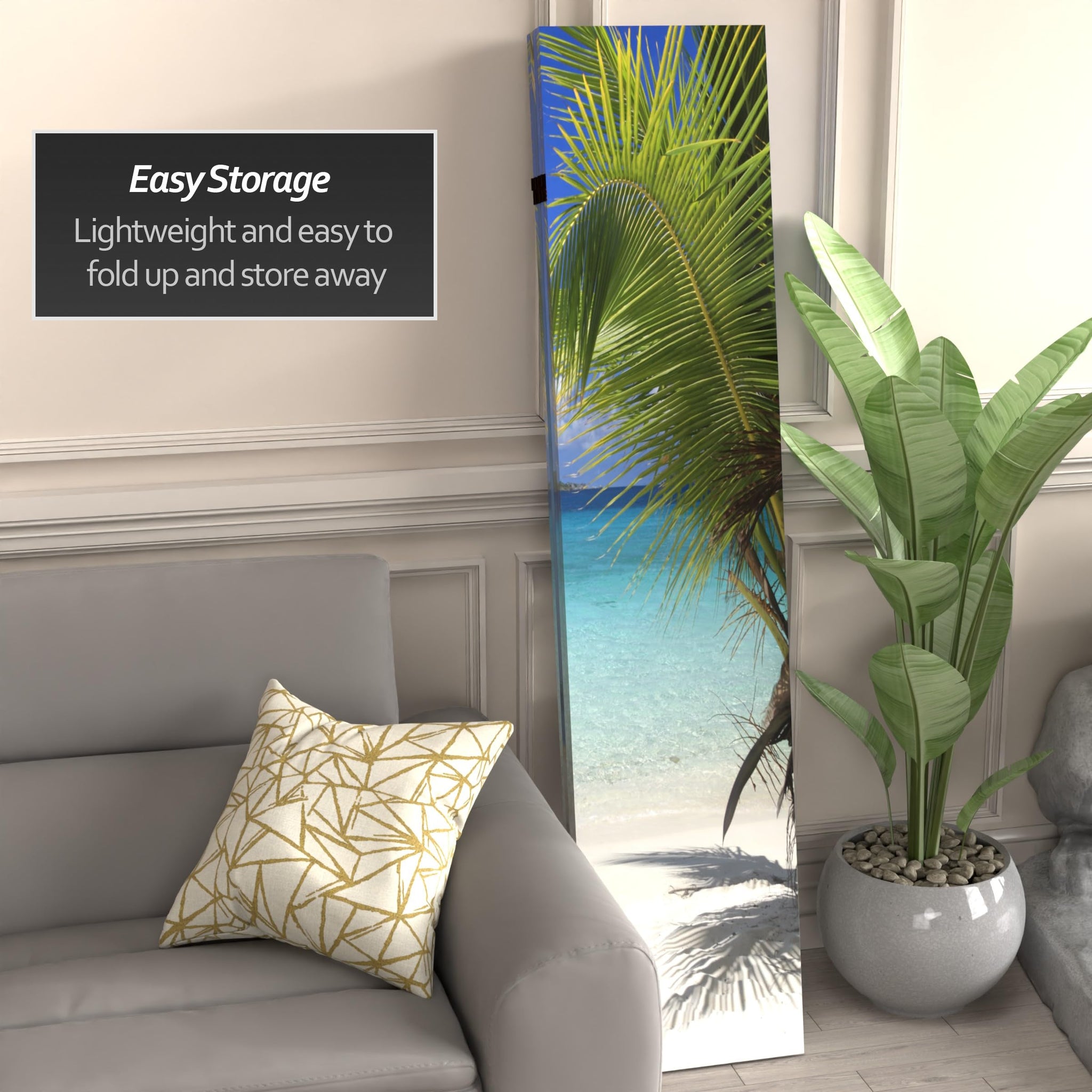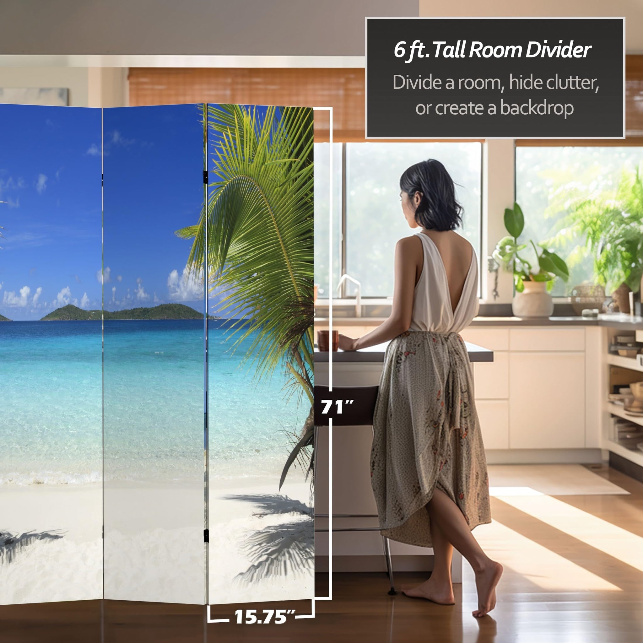 Details: Capture a piece of paradise with these two beautiful photographic prints of idyllic tropical beaches. On the front is a photo of two vacationers relaxing in the shade of a palm tree, admiring the deep blues of the sky and the sea. On the back is a picture of a beach on the Virgin Islands that will inspire you grab your snorkel and check ticket prices to the tropics. These peaceful, beautiful images will add a serene decorative accent to your living room, bedroom, dining or kitchen. This four panel screen has different images on each side, as shown.