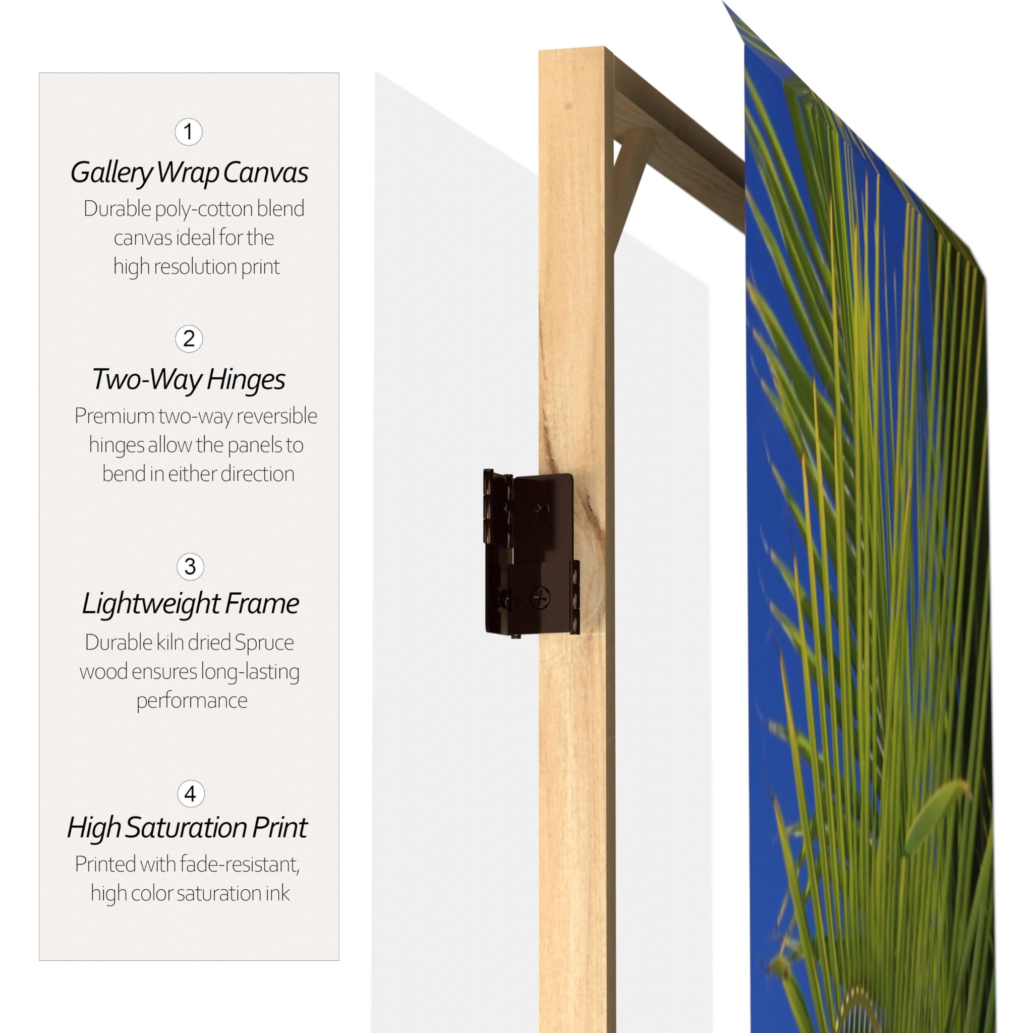 • High quality wood and fabric covered room divider. Well constructed, extra durable, kiln dried Spruce wood frame panels, covered top to bottom, front, back, and edges, with tough stretched poly-cotton blend canvas