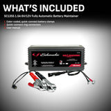 - In the Box: With your purchase, you will receive the Schumacher Electric SC1355 Fully Automatic Battery Maintainer, quick-connect battery clamp, quick-connect ring connector, and user manual