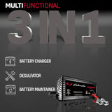 - 3-in-1 Device: Combines a battery charger, maintainer and desulfator into one compact unit