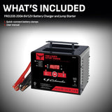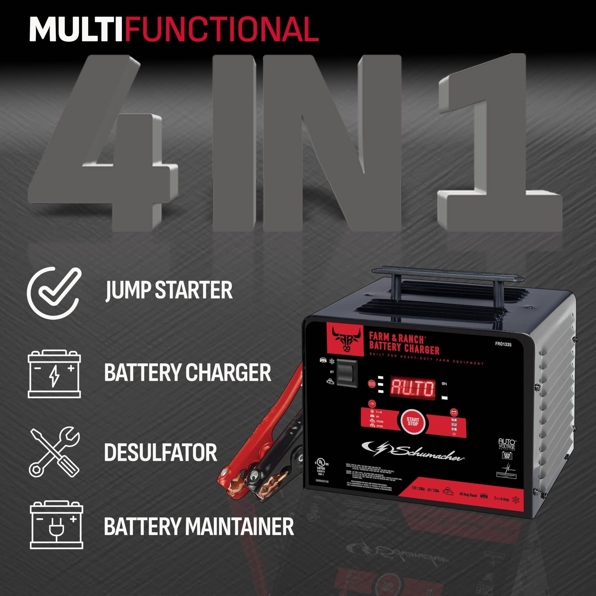 Details: The Schumacher FR01335 is a fully automatic battery charger and engine starter designed for use with heavy duty farm equipment. With 150 Amp (6V) and 200 Amp (12V) engine start options and 40A boost mode, this unit delivers results when you need it most. Microprocessor controlled to automatically adjust the amperage rate to charge and maintain, with multi-stage charging for added precision, safety and battery life. Includes float mode monitoring to automatically maintain optimum battery charge, as well as reverse hook-up protection with an LED light indicator that prevents the charger from operating if the clamps are reversed. Schu Eco Energy meets the highest industry standards. DOE compliant.