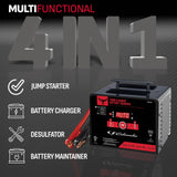 - 4-in-1 Device: Combines a powerful Battery Charger, Engine Starter, Boost Maintainer, and Desulfator