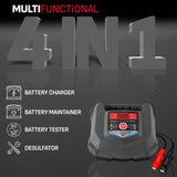 - 4-in-1 Device: Charges, maintains, tests, and desulfates batteries.