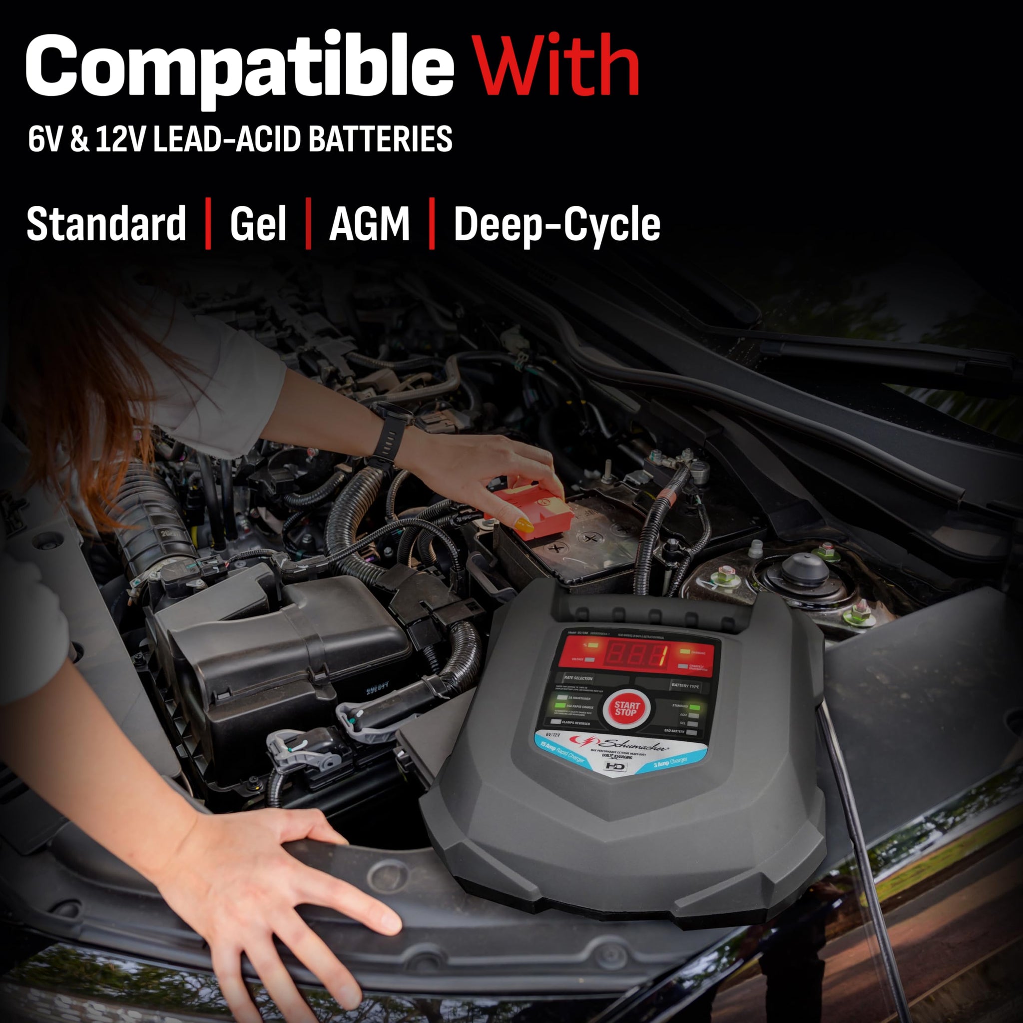 Meet the Schumacher SC1280 15-Amp 6-Volt/12-Volt Fully Automatic Battery Charger and Maintainer—your comprehensive solution for all battery-related needs! Whether you need to charge, maintain, test, or desulfate batteries, the SC1280 is engineered for exceptional performance. This versatile automotive battery charger is compatible with gas and diesel vehicles and supports 12-volt and 6-volt batteries, including standard, AGM, gel, and deep-cycle types, making it perfect for motorcycles, power sports vehicles, lawn tractors, cars, SUVs, trucks, boats, and more. Experience rapid and intelligent charging with the SC1280's state-of-the-art microprocessor technology. It automatically adjusts voltage to ensure efficient charging while protecting your battery from damage. Once your battery reaches full charge, the automatic operation feature seamlessly transitions to maintenance mode, promoting optimal battery health. Additionally, the advanced battery restoration mode detects issues and significantly enhances both performance and lifespan. Designed with safety as a priority, this Schumacher battery charger includes built-in damage protection features that prevent incorrect connections and manage faulty batteries, making it a reliable choice for both DIY enthusiasts and professional mechanics. The SC1280 offers a powerful 15-amp rapid charge alongside a 3-amp charge/maintain mode, complete with auto voltage detection and float mode monitoring to maximize battery wellness. Multi-stage charging further elevates performance, ensuring it's the ideal 12v charger for any application. Additional features include reverse hook-up protection, bad battery detection, an intuitive digital display, LED indicators, push-button controls, and color-coded clamps for effortless handling. Choose the robust 15-amp rate for larger batteries in automotive, marine, and light trucks, or select the 3-amp rate for smaller batteries found in garden tractors, snowmobiles, and motorcycles. Whether you need a car battery charger, marine battery charger, or a deep cycle battery charger, the Schumacher SC1280 has you covered. Equip yourself with the SC1280 and ensure your batteries are always ready to go. This is the ultimate 12v battery charger solution you’ve been looking for! Order now to experience reliable and efficient battery maintenance and performance enhancement!