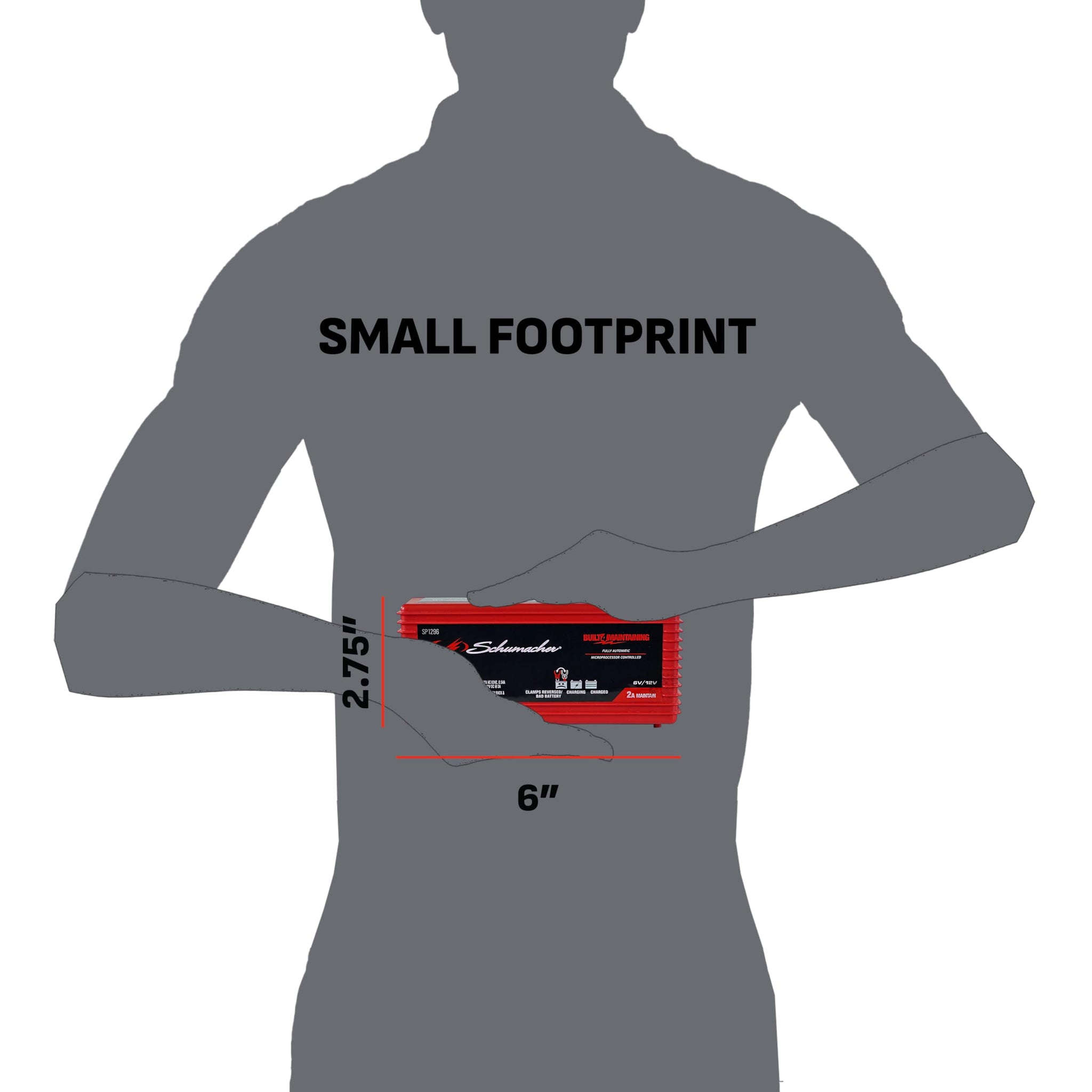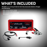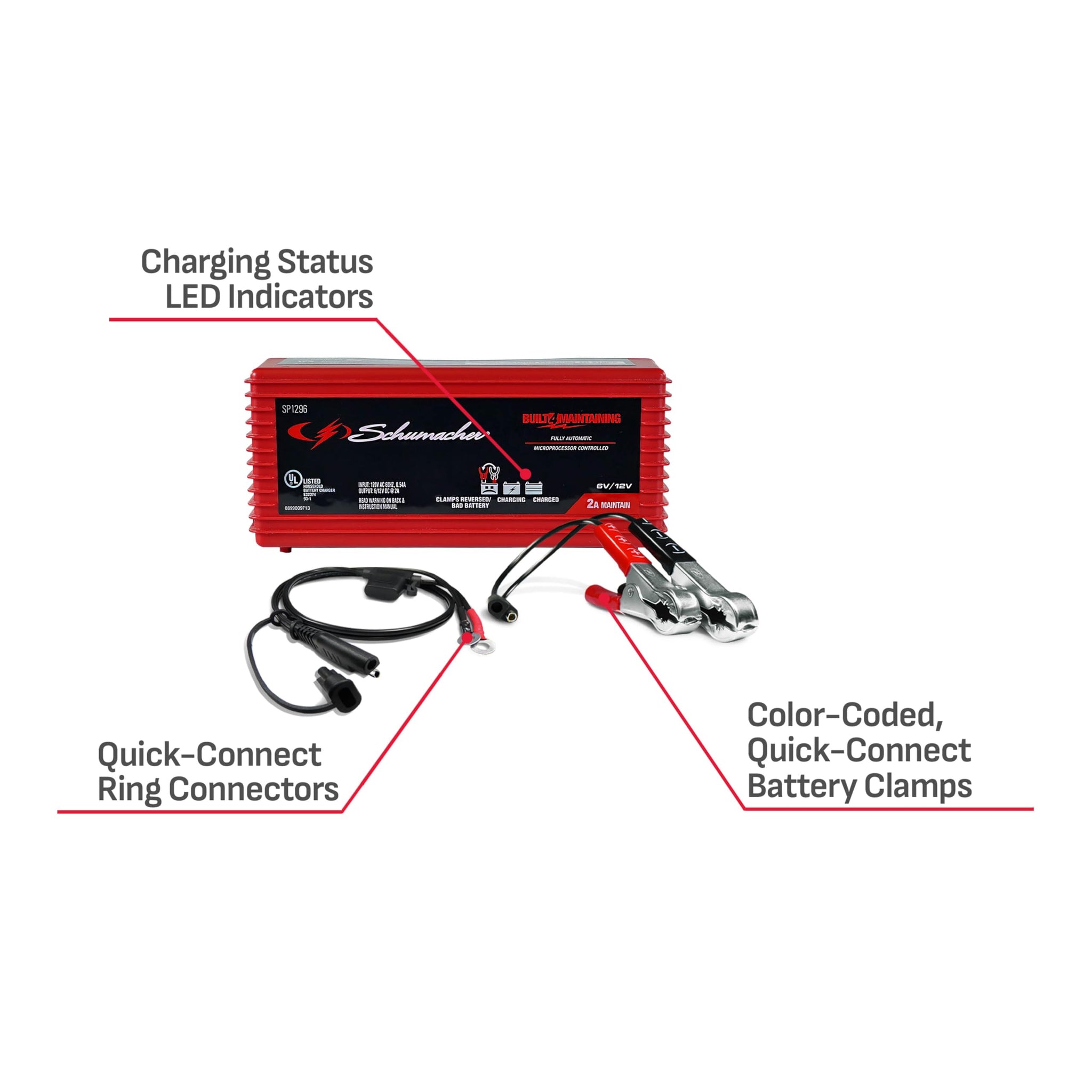 - Complete Package - Schumacher SP1296 2 Amp 6 Volt and 12 Volt Fully Automatic Battery Charger and Maintainer, quick-connect battery clamps, quick-connect ring connector, quick-connect 12 volt accessory plug, and user manual