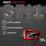 - 3-in-1 Device - Battery charger, battery maintainer, and battery desulfator