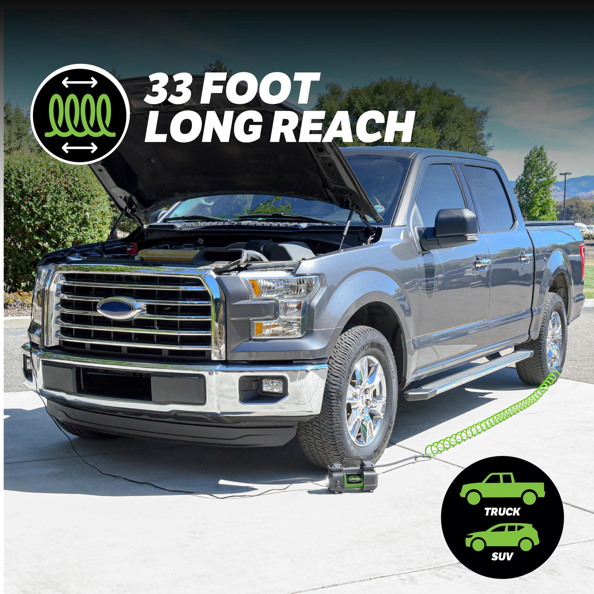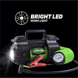 - The Tire Inflator has a long power cord with alligator clips for your car battery and features a built in dial gauge (0-150 psi), a bright LED light and an extra long air hose