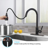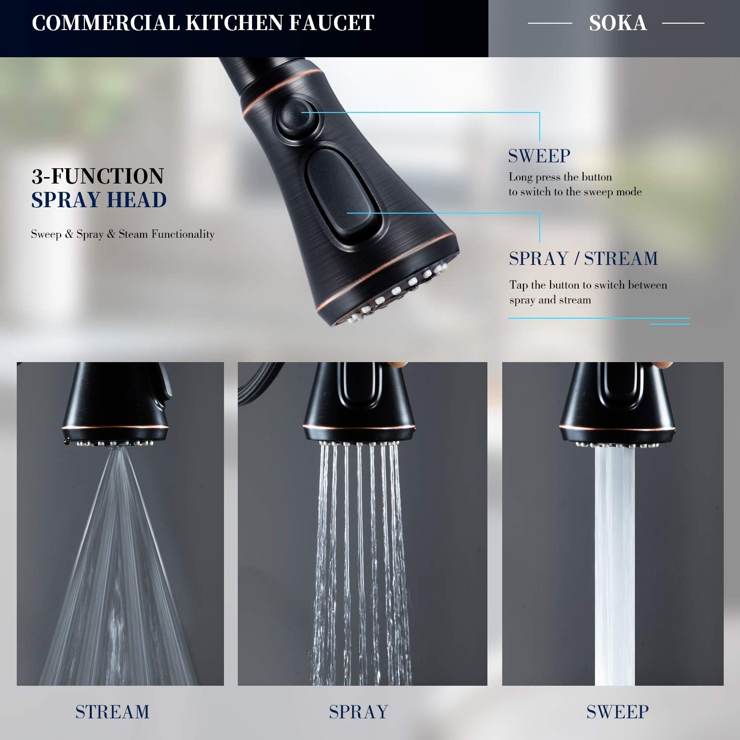- Three Working Modes & Pull Down Sprayer Head Our kitchen faucet with 3 setting modes(STREAM/ SPRAY/ SWEEP), stream for filling water,spray for strong cleaning wash, powerful sweep blade to clean dishes. The Kitchen Faucet Sprayer Head is Neoperl ABS areator wich can be removed by a coin easily for clean and replacement.