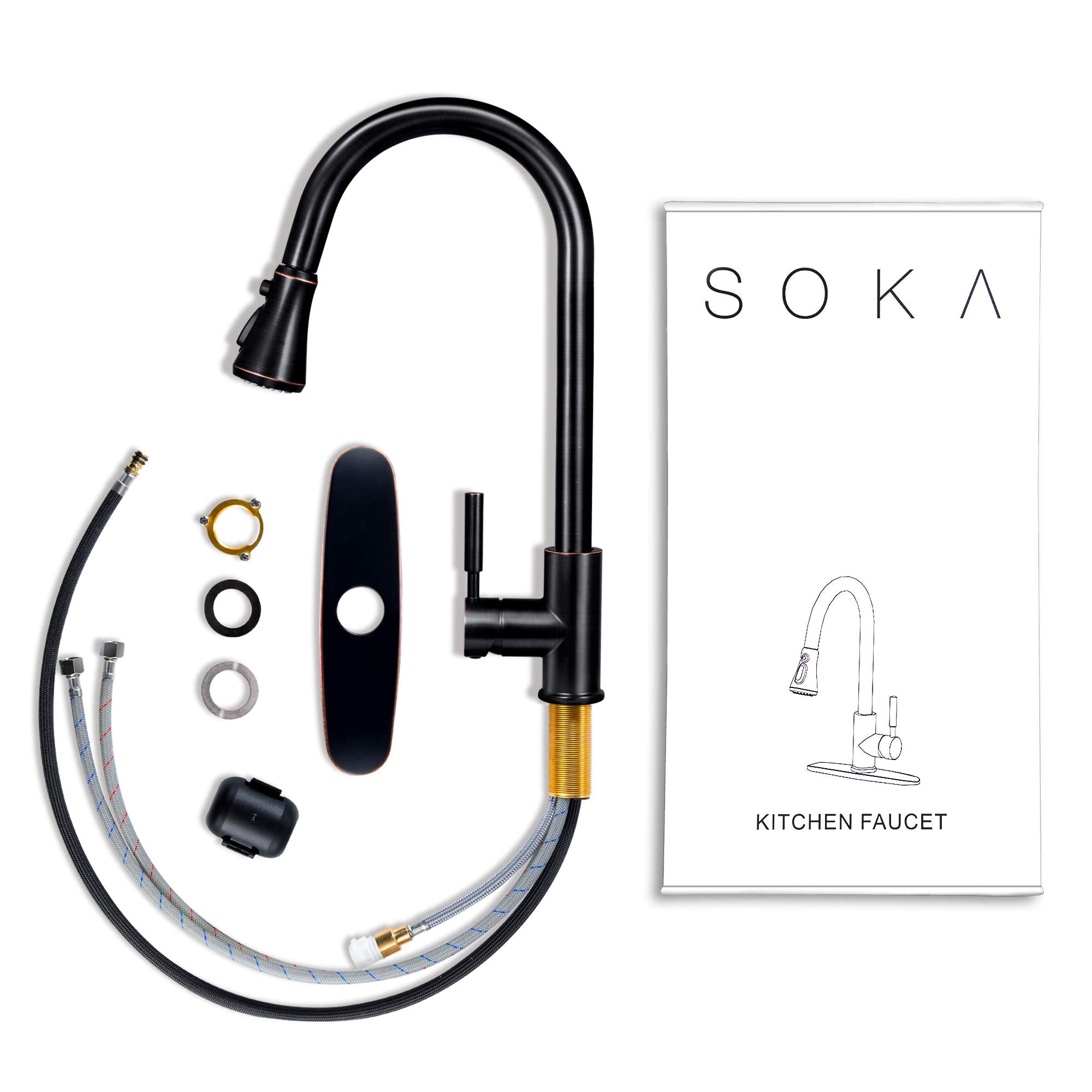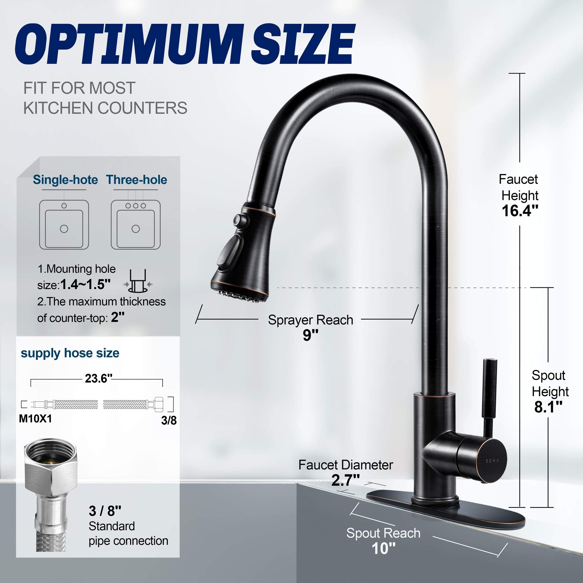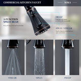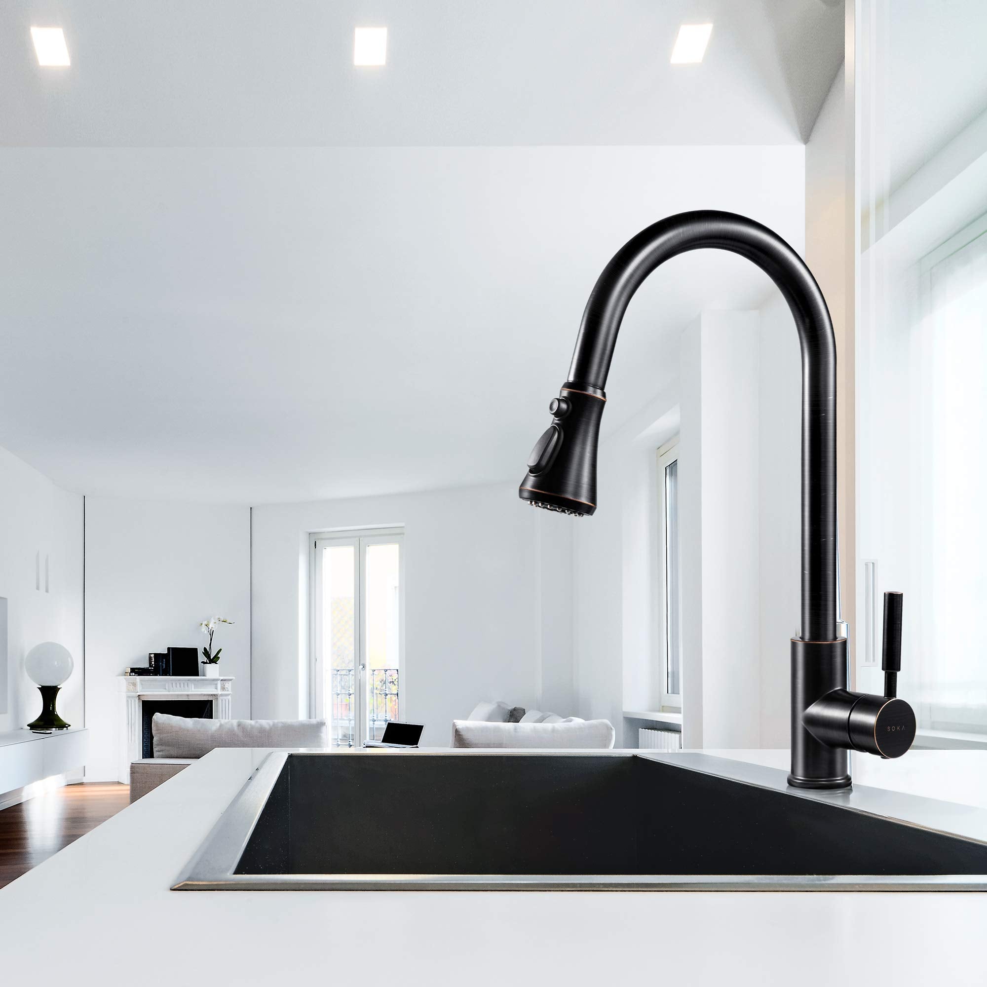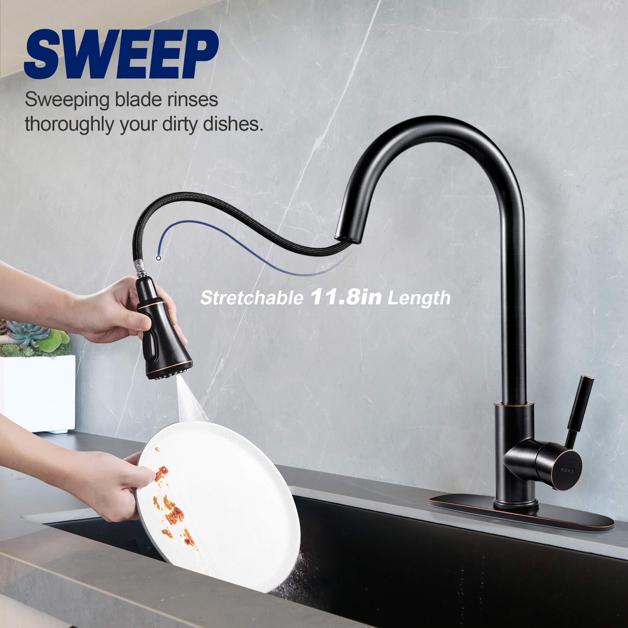 - Elegant Design & Easy to Match Kitchen faucet with oil rubbed bronze finish and sleek industrial style offer contemporary good looks, the pull down sink faucet was very easy matching with the rest of your furniture.Proper faucet size and water outlet angel fit most of sinks,save your time to make choice.