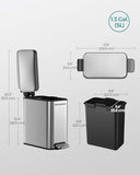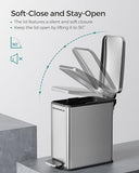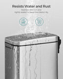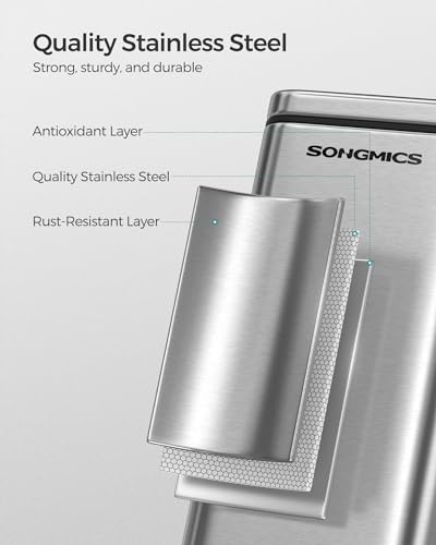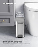 Introducing the sleek and functional SONGMICS Bathroom Trash Can, designed to fit seamlessly in small spaces with its slim profile. This 1.3 Gallon (5 L) trash bin is perfect for keeping your bathroom tidy and organized. Made of high-quality stainless steel, this garbage can features a soft-close lid for a quiet and smooth operation. Upgrade your bathroom with the Silver ULTB560E05 trash can today!