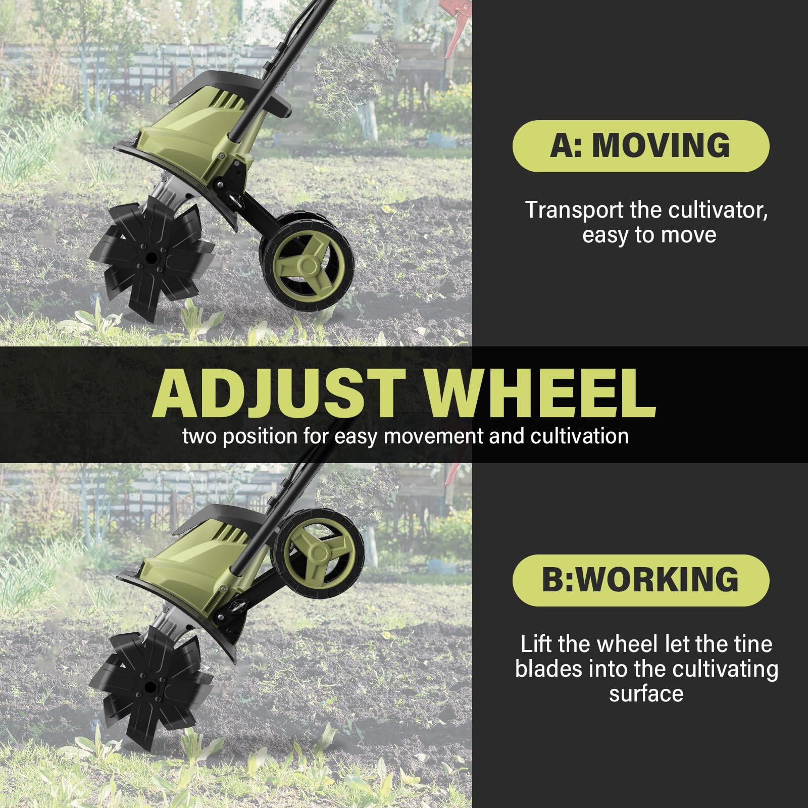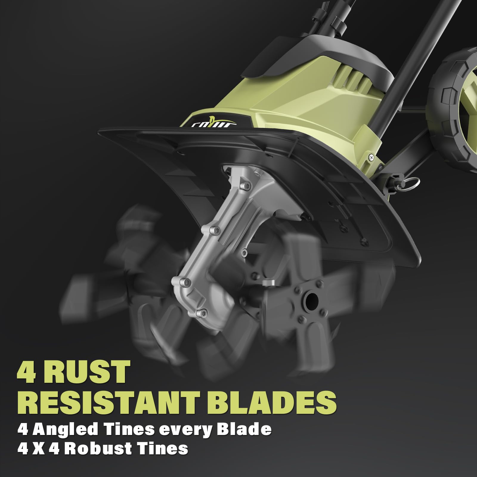 • High Efficiency - Powered by a robust 12Amp motor and featuring four rust-resistant blades with 16 steel teeth, this rototiller delivers powerful performance at 360RPM, making it the perfect garden tiller for tackling tough garden soil.