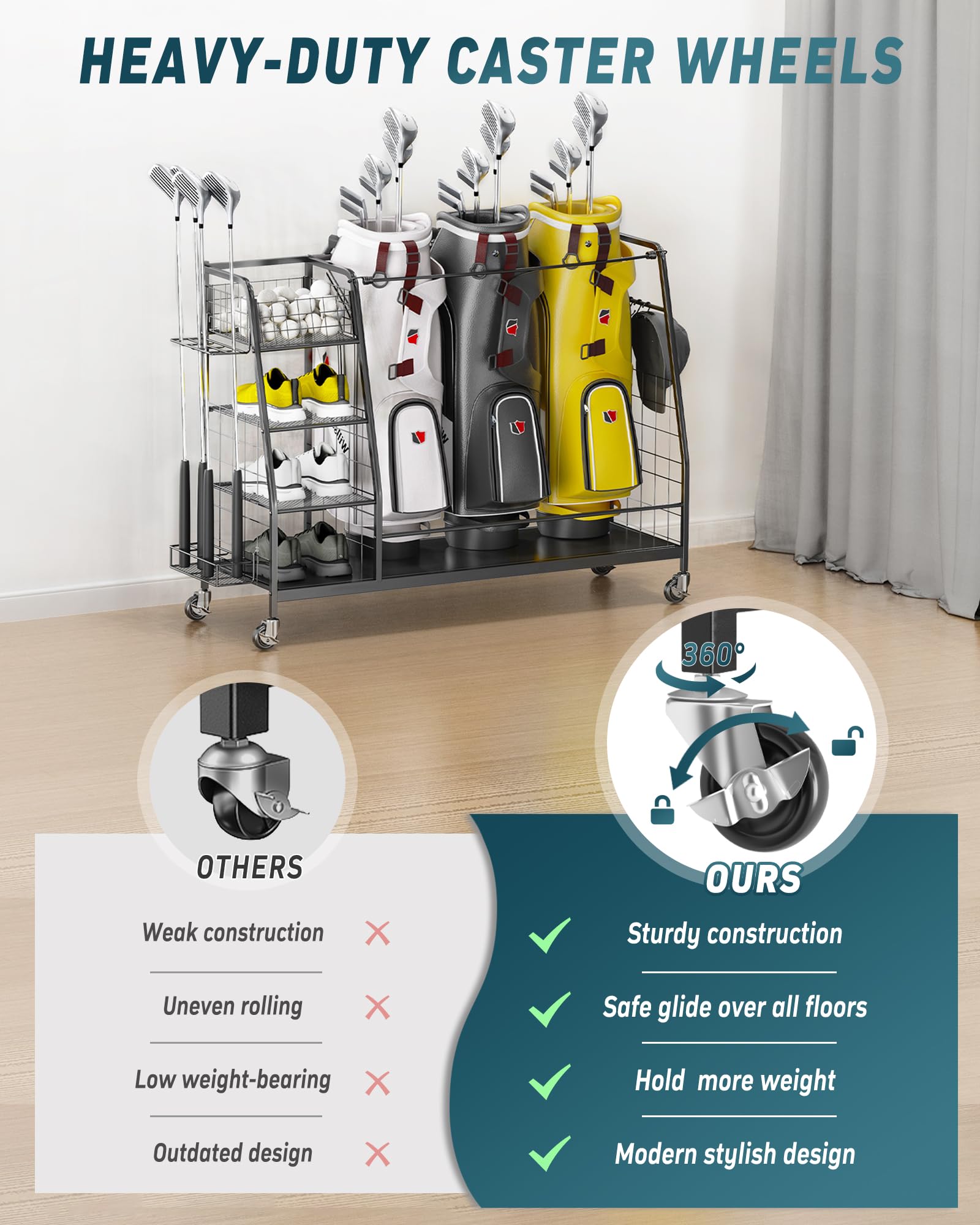- 【Heavy-Duty Casters】The golf bag club Holder features four heavy-duty casters for easy indoor or outdoor mobility. Ideal for garages, basements, golf clubs, and storage rooms, we offer lockable casters or leveling feet for stability on uneven floors.