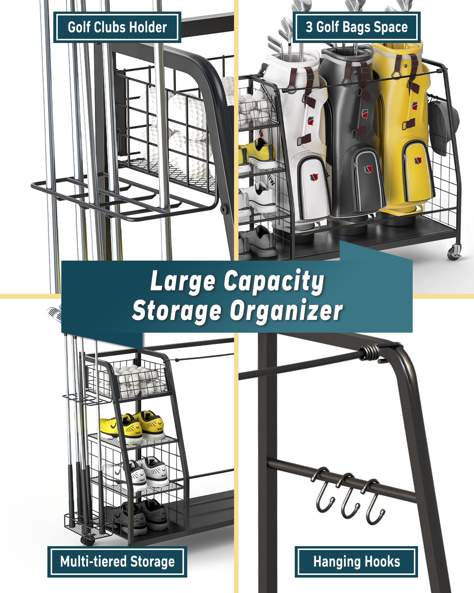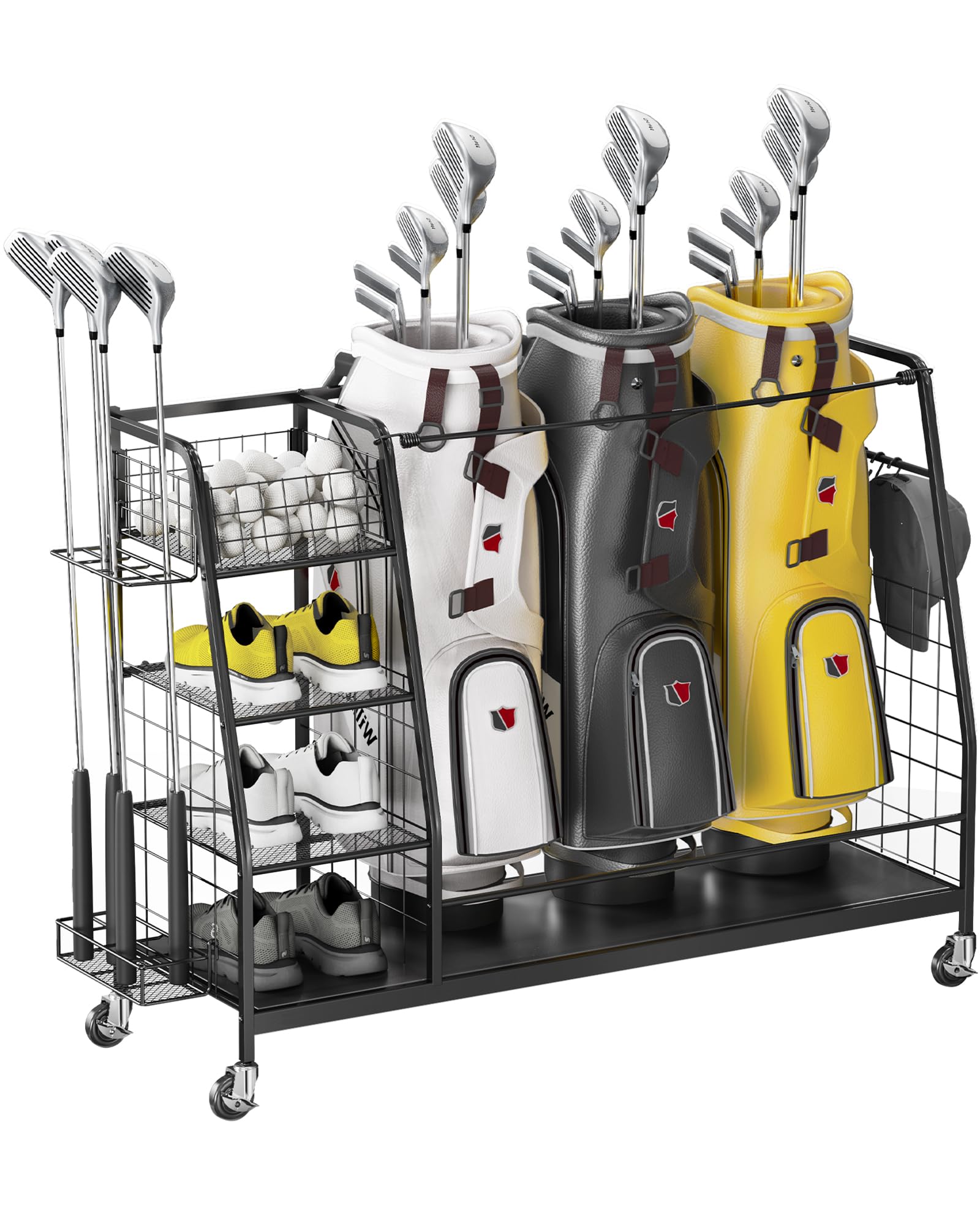 - 【Extra Large Capacity】Elevate your golf storage with the Staransun golf bag organizer for garage, capable of holding up to 3 golf bags. Featuring 3 shoe rack layers, 3 removable hooks, and a golf ball basket, keep all your golfing equipment organized in one spot.