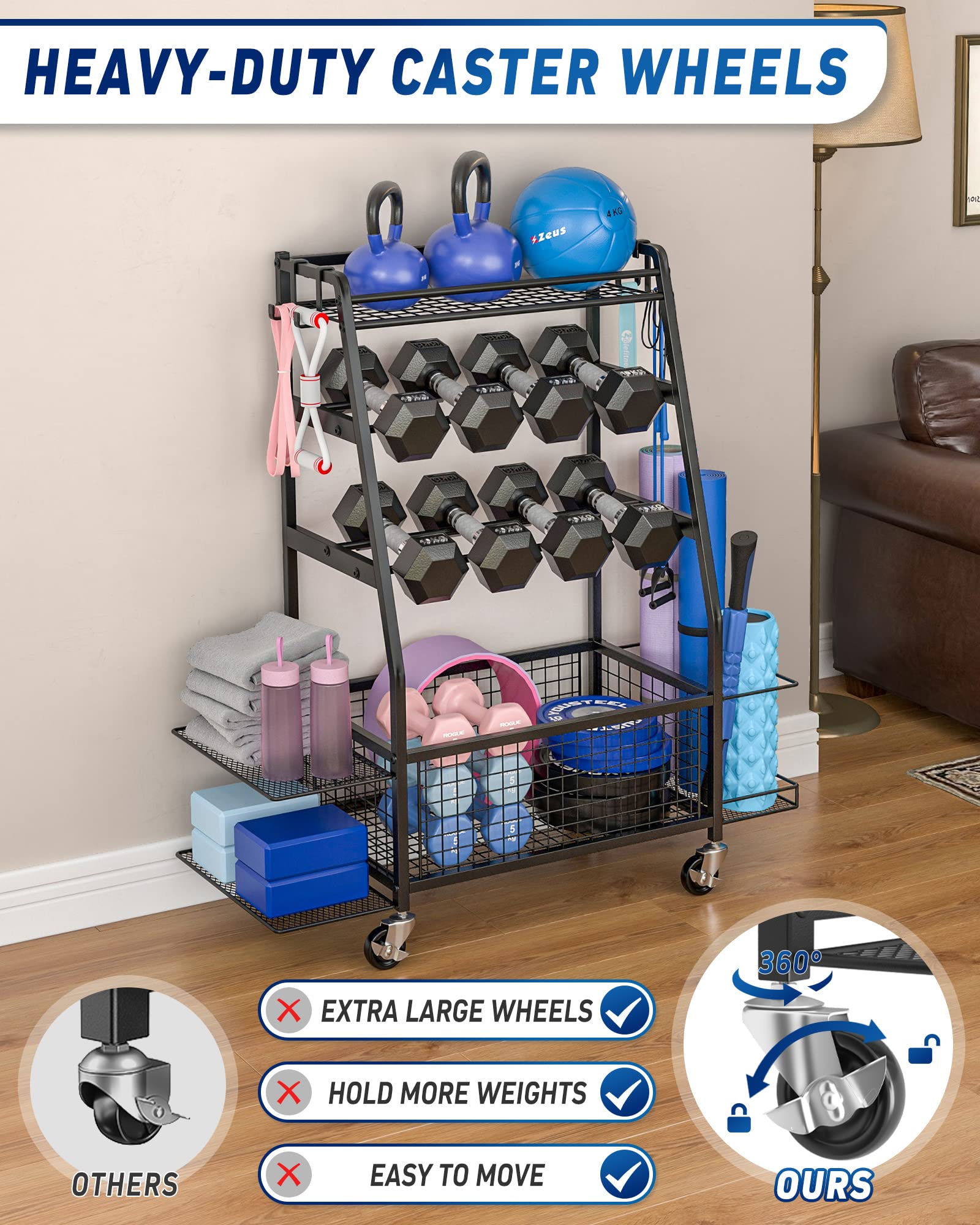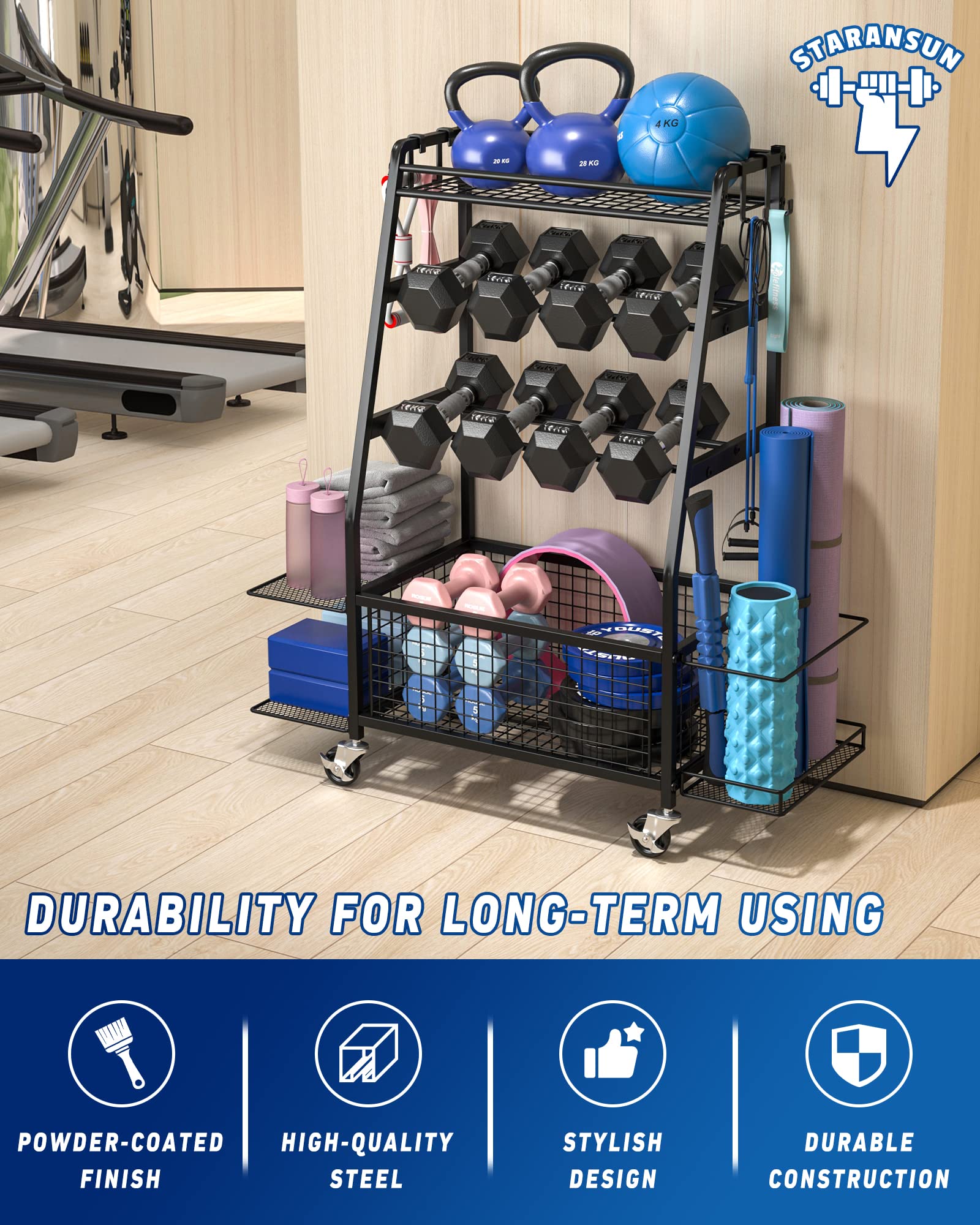PLKOW Dumbbell Weight Rack, Home Gym Storage for Kettlebells Yoga Mat and Balls, All in One Workout Storage with Wheels and Hooks, Powder Coated Finish Steel