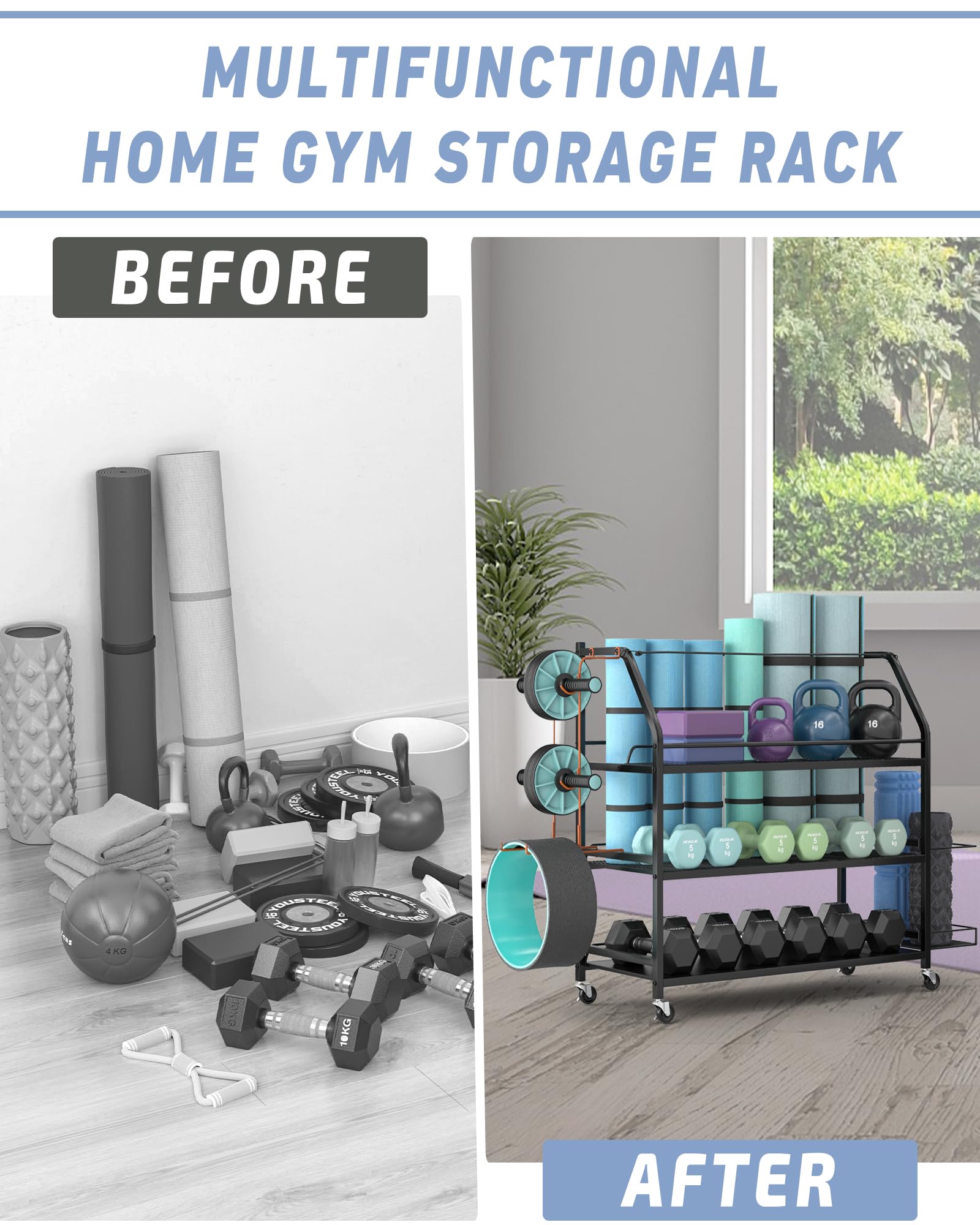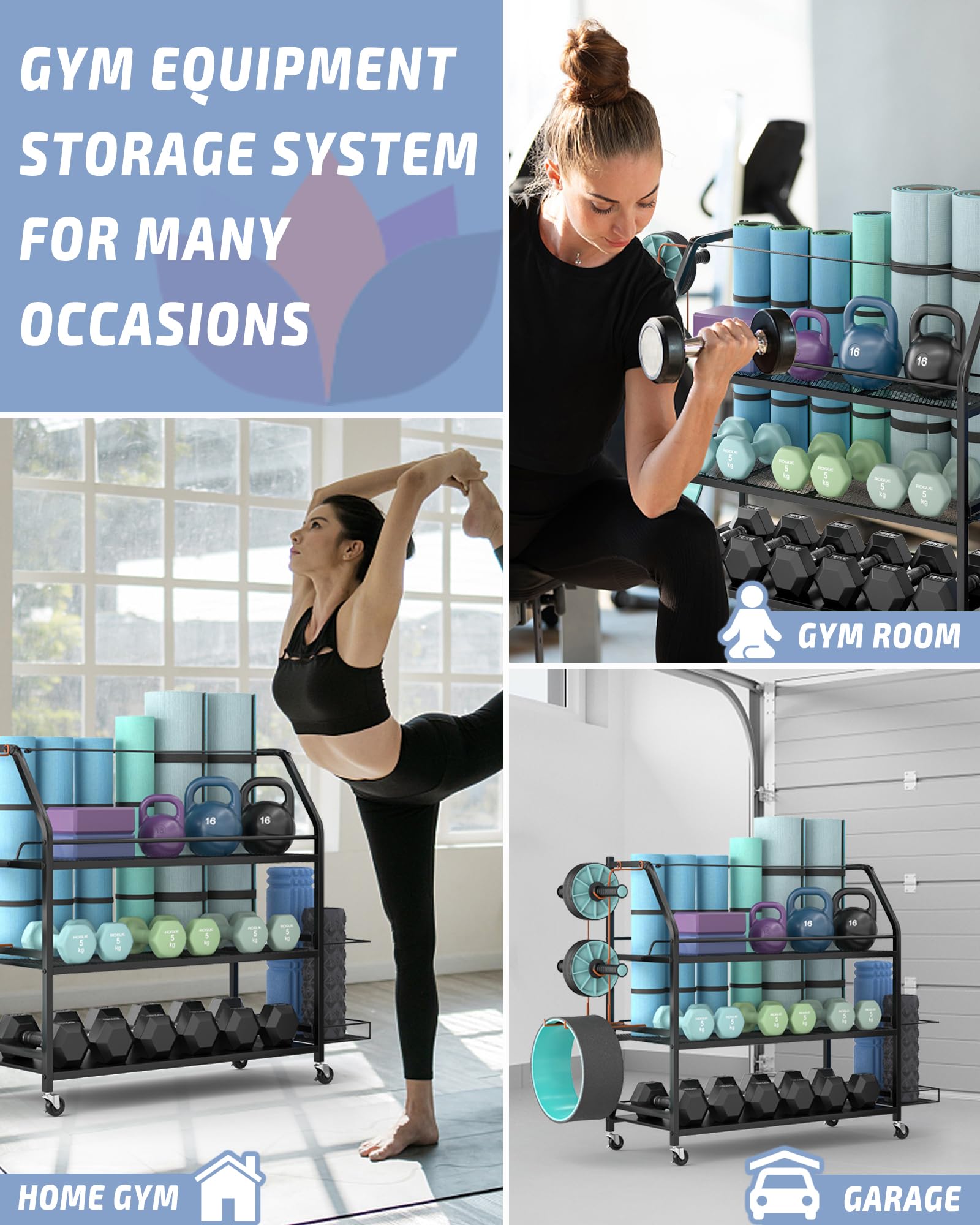 PLKOW Dumbbell Weight Rack, Home Gym Storage for Kettlebells Yoga Mat and Balls, All in One Workout Storage with Wheels and Hooks, Powder Coated Finish Steel