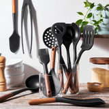 - Set includes: 2-in-1 multi-function spatula spoon, ladle, wok turner, slotted serving turner, serving spoon, spatula, skimming ladle, tongs, pastry brush, and risotto spoon