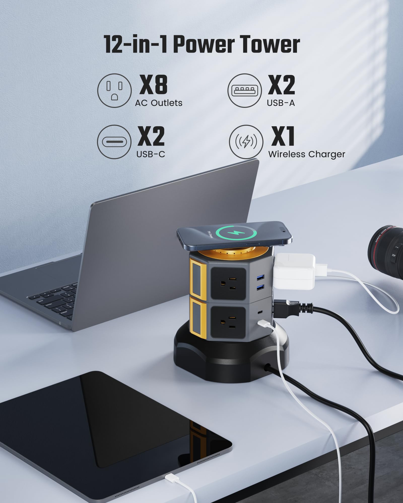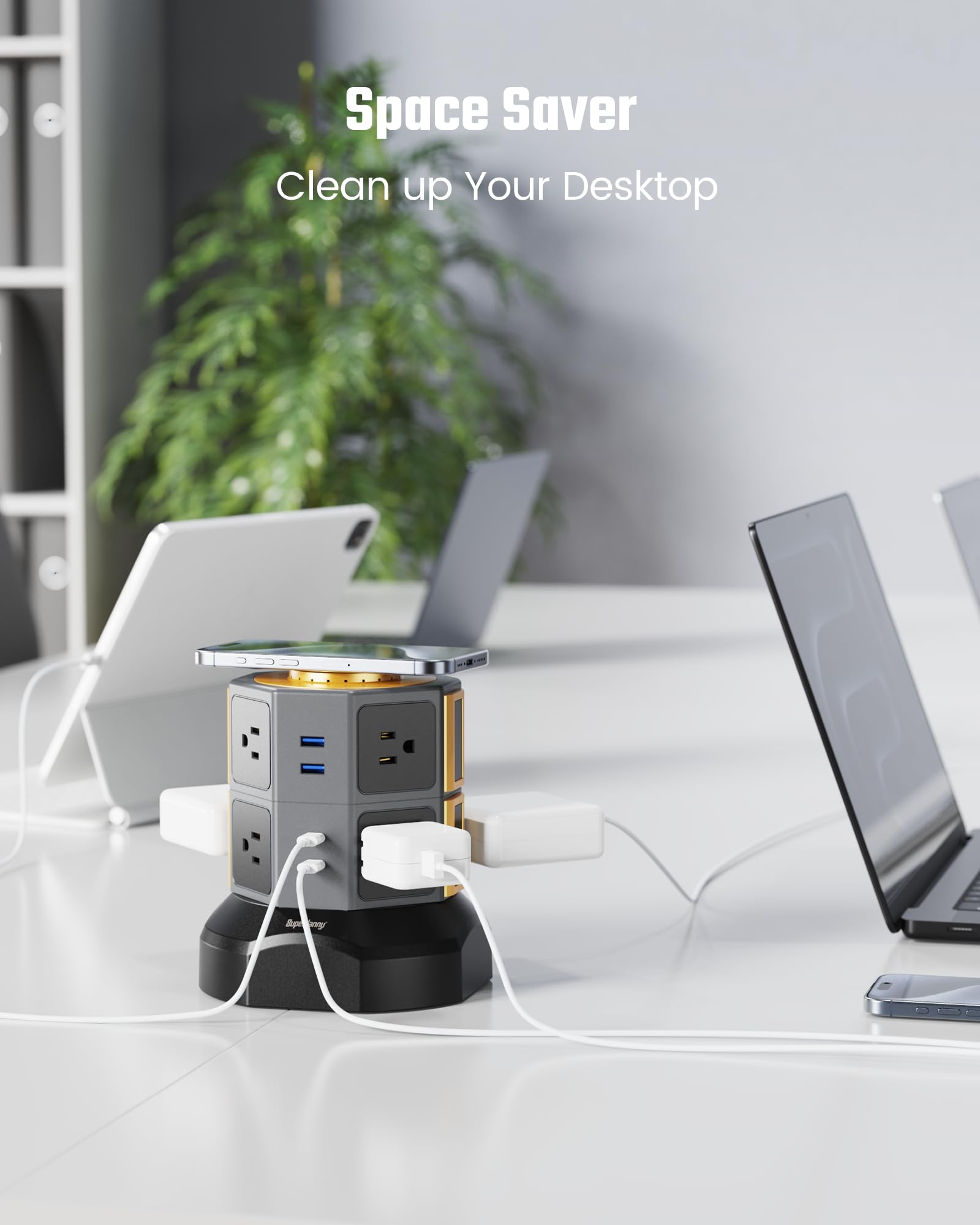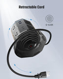 - ⚡【Space Saving and Retractable】The small footprint power tower manages its 6.5ft power cord by rolling the main body, combined with vertical tower design with a small footprint base to offer you a self-adjusting reach to the wall outlet but covers zero extra space, keeping your desk clean and tidy.