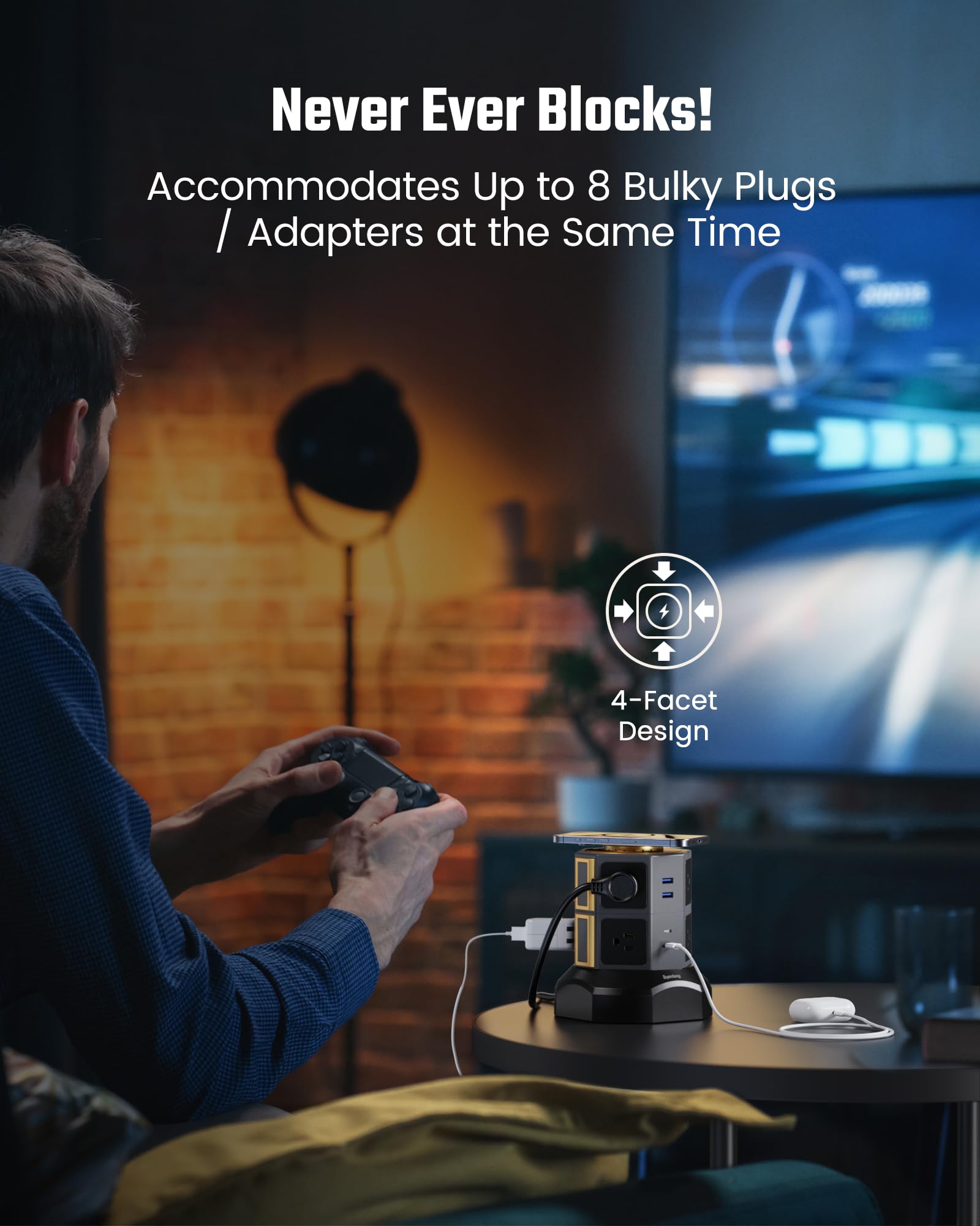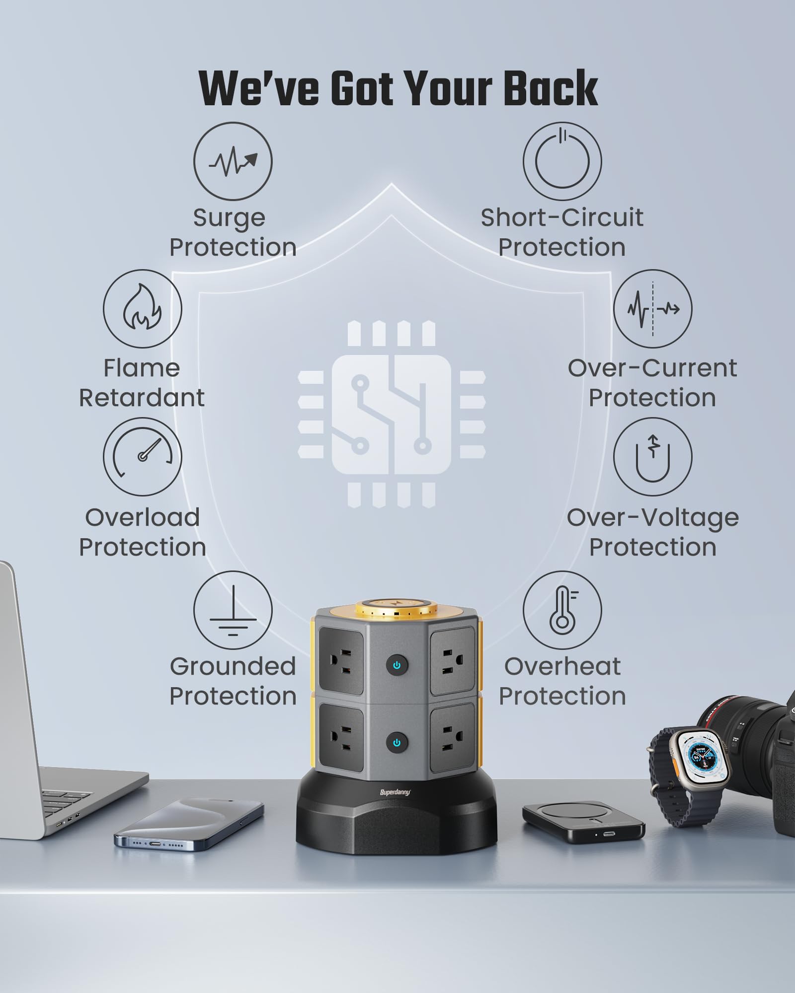 - ⚡【World-Wide Use & Surge Protector】This power strip surge protector tower (rated current 13A) is designed with dual voltages: 110V~240V, which made it compatible with multiple devices with right adapters through out the world; 1050J surge protection joules is armed to keep your devices away from surge hazard.