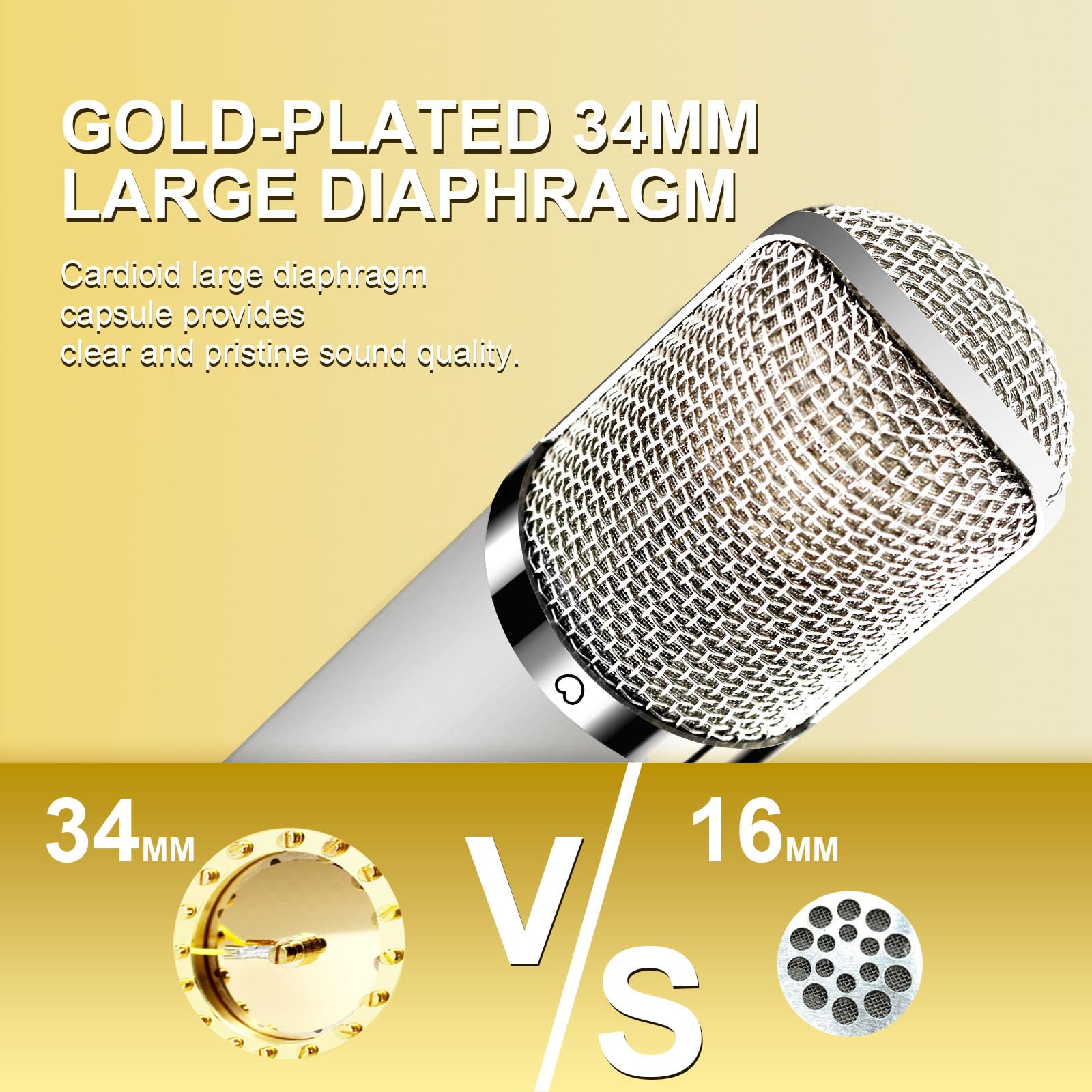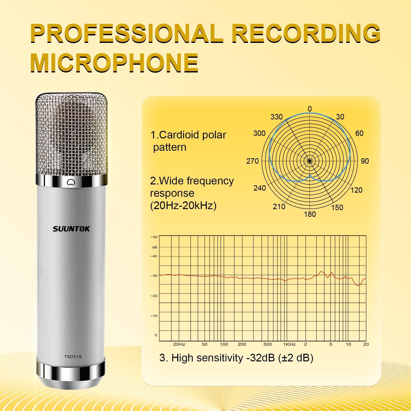 - [XLR CONDENSER MICROPHONE]: Although adopting the look of EM251, our recording microphone has its own advantages. We use self-produced 34MM large diaphragm gold spluttered capsule to output pristine, detailed, rich, smooth, and pleasing sound. And our upgraded 3-pin connector could transit clear sound. Besides the wide ranging frequency response(20Hz-20KHz) could capture the full audible spectrum and the sensitivity of the mic is up to -32dB(±2 dB) for clear and natural sound pickup effect.