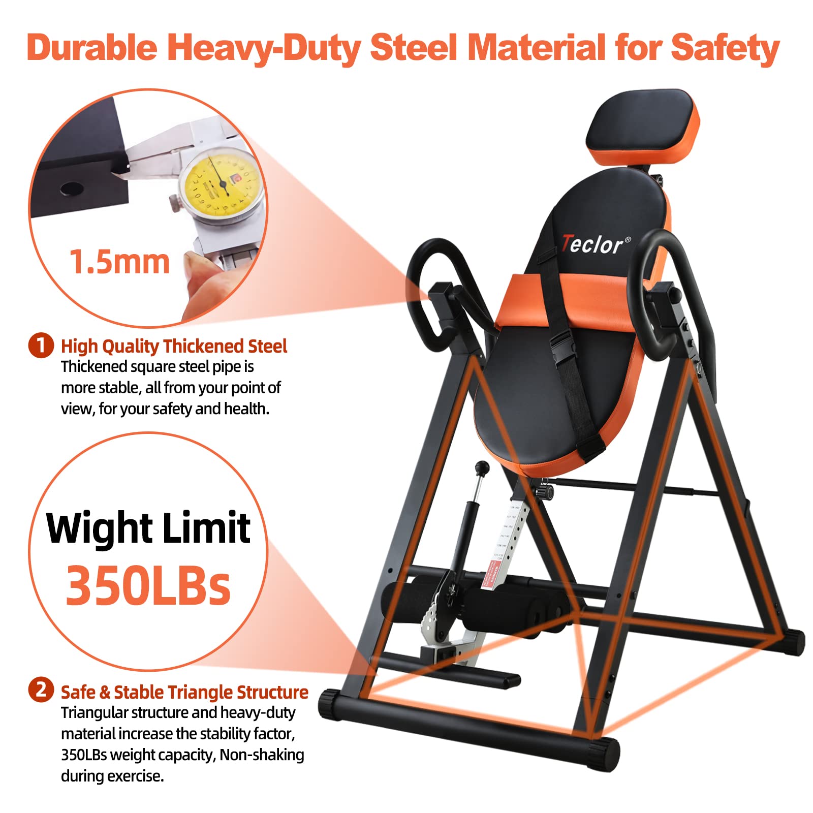 Teclor Inversion Table for Back Pain Relief, 350 lbs Capacity Strength Training Inversion Equipment, Decompression Table for Pain Therapy Training with Safe Belt & Comfortable Ankle Holders