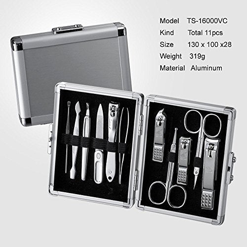 • Included (Total 11 Pcs: Nail Clipper, Toe Nail Clipper, Cuticle Trimmer, Small Nail Clipper, Beauty Scissors, Tweezers, File, Safety Scissors, Double-sided Push Stick, V-Shaped Push Stick, Ear Pick: TS-16000SVC).