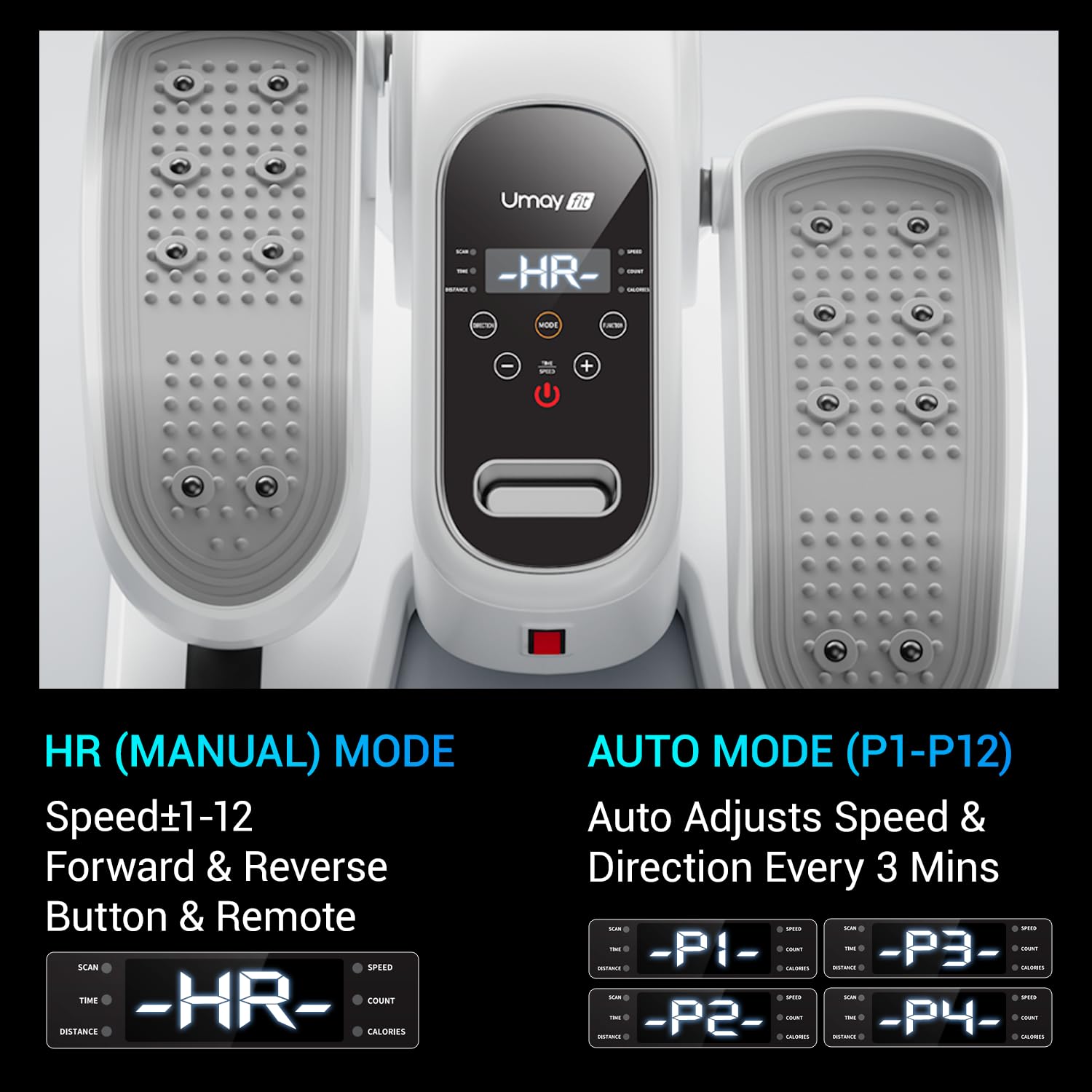 • Auto & Manual Modes: UMAY elliptical provides Auto & Manual Modes for you, elderly people can choose 1-4 levels of low speed for leg exercise and relaxation. In Manual mode, you can set workout time of 15-30min, 12 speeds and forward&backward direction by remote control or button of the elliptical machine. The speed and direction have been programmed in Auto mode, you can adjust P1-P12 mode by press mode button, the speed changes every minute and the direction changes every 3 minutes