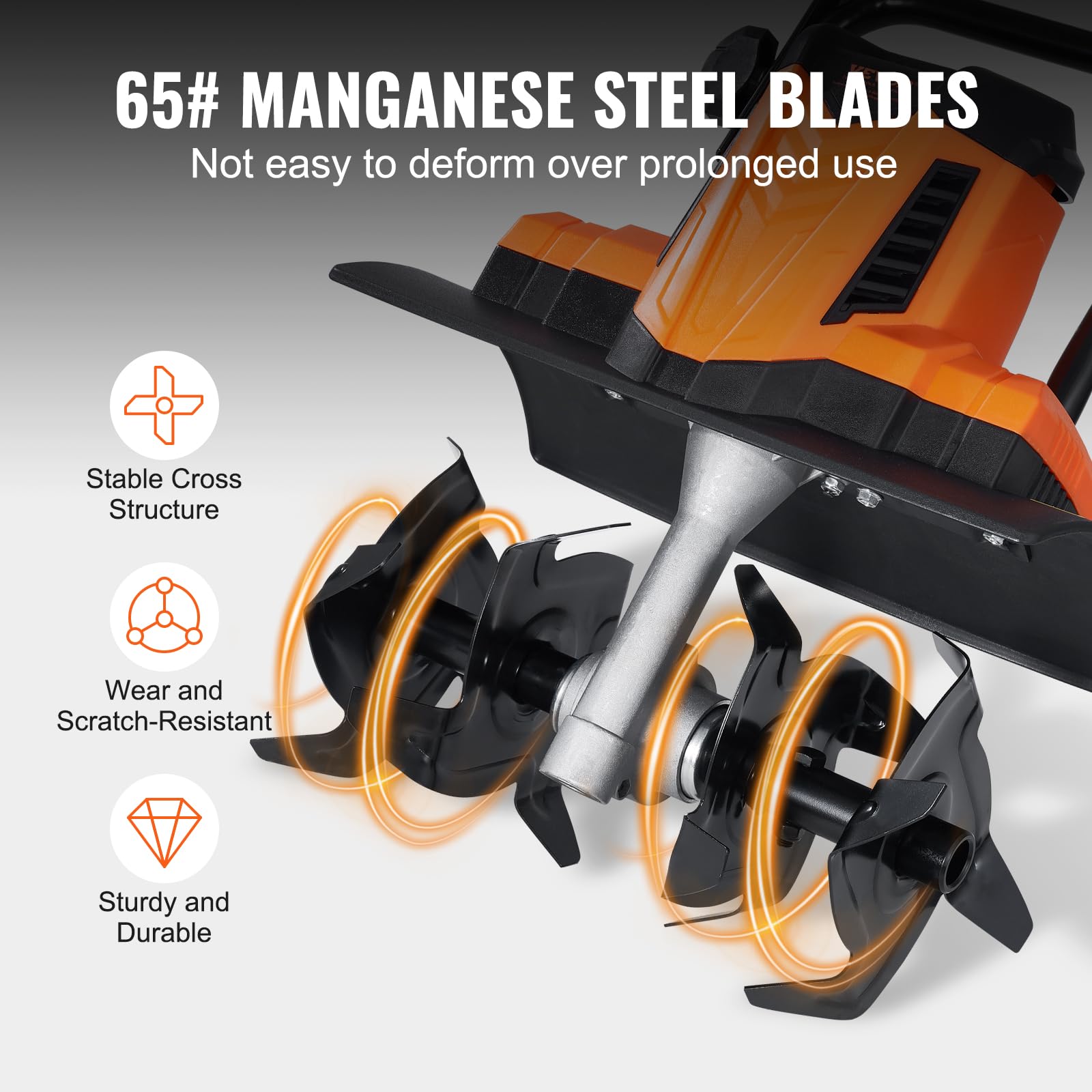 - High-performance Motor: The powerful 10A motor with 390 PRM delivers robust performance and high efficiency. It can handle large areas of soil or tough ground, making tilling easier. Equipped with an overload protection system, it automatically shuts off if it is obstructed, preventing damage and extending its lifespan.