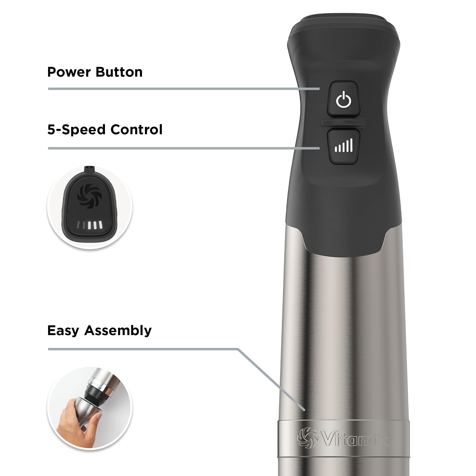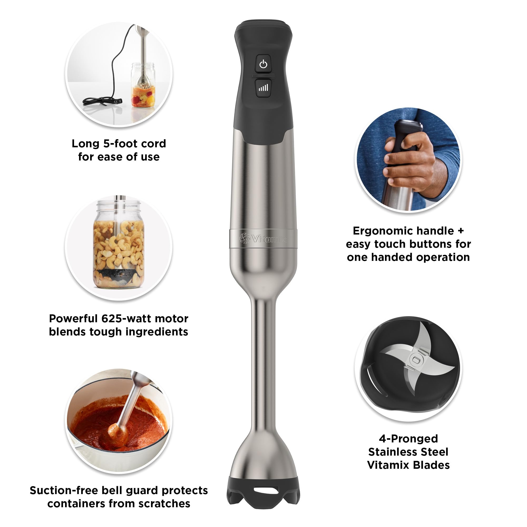 Details: Vitamix power in a hand-held blender, plus a convenient storage case and whisk attachment. Versatile Attachments: The 3-Piece Immersion Blender Bundle comes with a whisk attachment and storage case Powerful Motor: The 625-watt motor easily blends tough ingredients for all your favorite recipes One-Handed Operation: Whether you’re right- or left-handed, the Immersion Blender makes it easy to operate the blender with one hand while adding ingredients with the other Precise Textures: 5 speeds and our 4-pronged blade help you create your ideal textures for every blend Blend in Any Container: With our Immersion Blender, you can blend in any container with a 3-inch wide (or larger) opening, including a smoothie cup or a 1-quart wide-mouth Mason jar