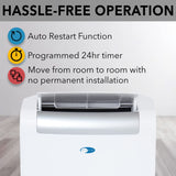 - ADVANCED SELF-EVAPORATION: Dual hose operation; Cools and heats up to a 450 square foot space (ambient temperature and humidity may influence optimum performance); Dehumidifying capacity: 71 pints per day; Air Flow (at high speed): 497m3/h / 292CFM; 3 fan speeds