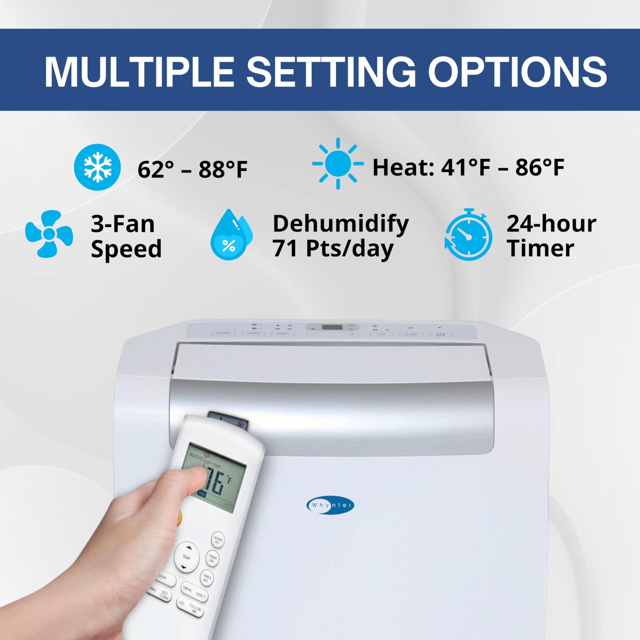 Details: Harness the power of versatile climate control with the Whynter ARC-148MHP 14,000 BTU (10,000 BTU SACC) Portable Air Conditioner. This advanced Portable AC unit delivers cooling, heating, dehumidifying, and fan functions to maintain optimal comfort in spaces up to 500 sq. ft. The Activated Carbon and washable SilverShield Filter, paired with the Auto Drain Pump (heating mode only), ensures fresh, clean air while efficiently managing humidity levels. Choose Whynter, a trusted US-based brand since 2006, for high-performance, portable air conditioning and heating that delivers year-round climate control.