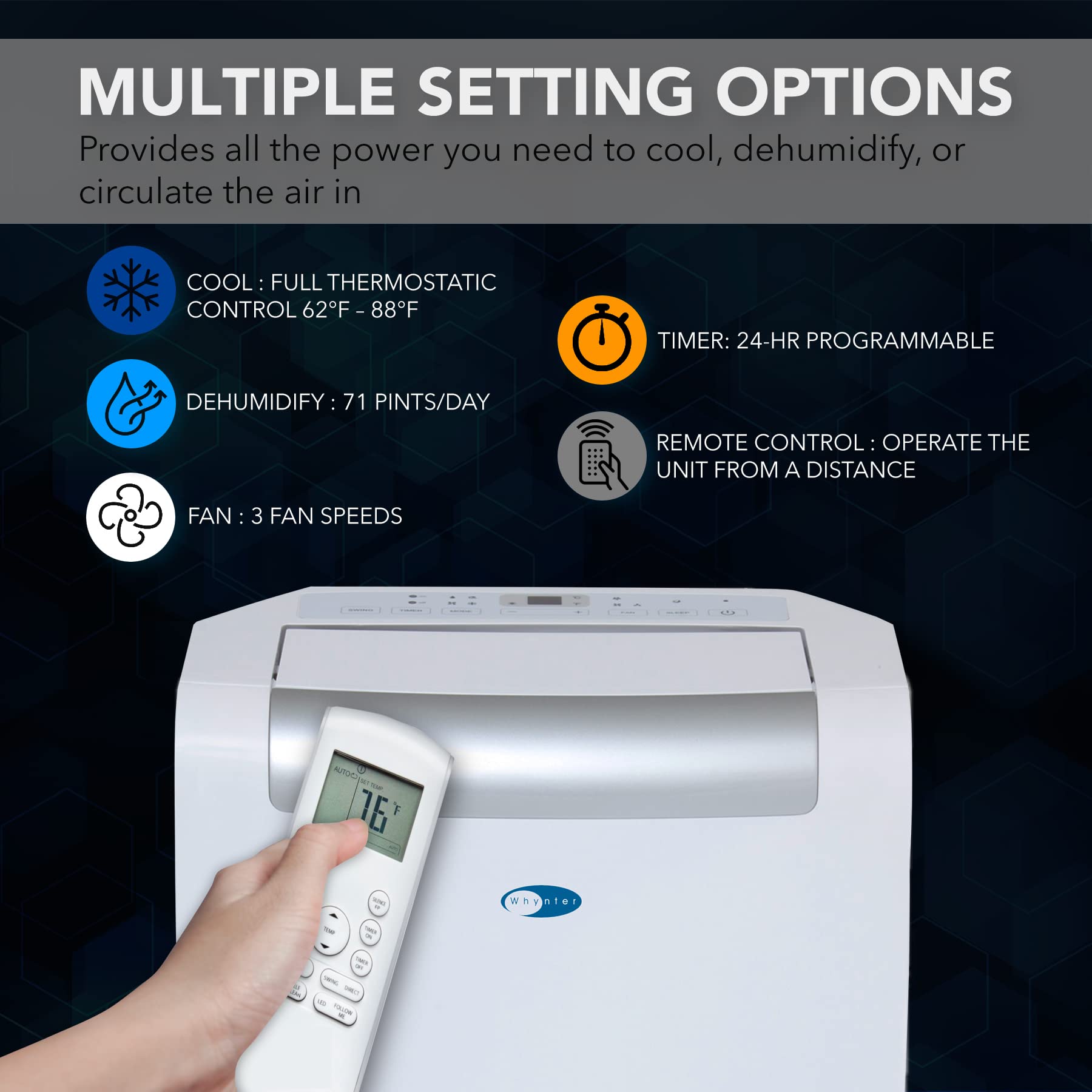 - MULTI-FUNCTIONAL & ENERGY SAVING: Five operational modes: Cool, Heat, Dehumidify, Fan and Auto; Full thermostatic control – 62° – 88°F (with ambient conditions above 45° F in heating mode); Maximum power consumption: 1300W/ 11.3A; Power supply: 115 V / 60Hz / 1 Phase; Refrigerant: R32