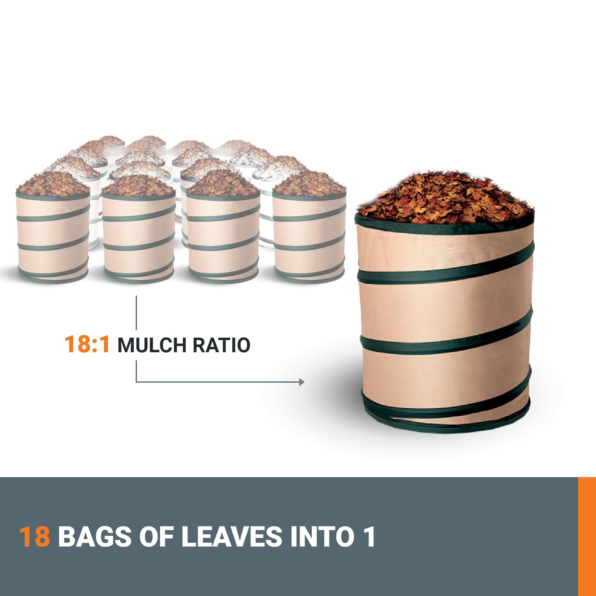 - EFFICIENT 18:1 MULCH RATIO: Reduce workload by mulching 18 bags of leaves into one.