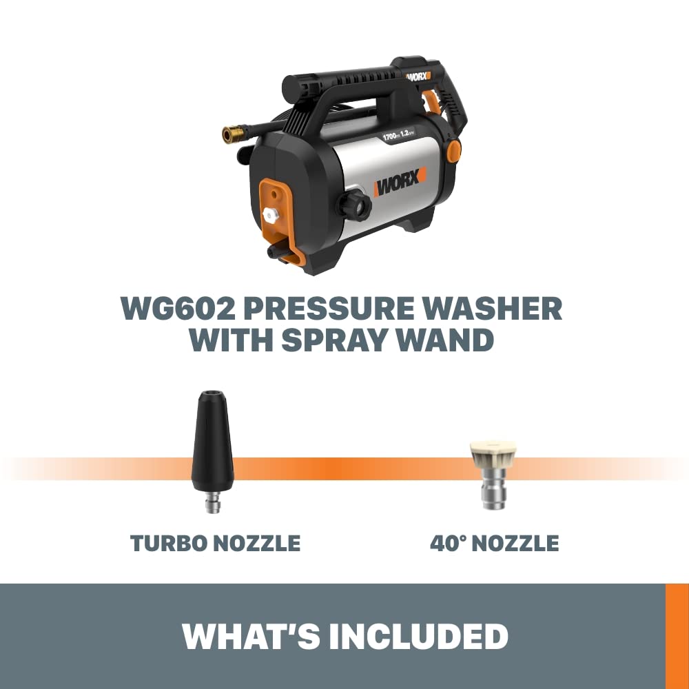 Details: The Worx 13-Amp Electric 1700 PSI Pressure Washer generates enormous cleaning power for dirt and grime removal around the exterior of the home or property. It produces 1870 PSI MAX and 1.2 GPM (1.4 GPM MAX) to make quick work of cleaning the driveway, deck, siding, or brickwork. It’s also a great tool for blasting mud out of outdoor camping or sporting equipment or for muddy cars and SUVs. This pressure washer comes with a turbo nozzle, when you need maximum pressure, say, for brickwork, and a 40-degrees nozzle for when you need a lighter touch. Plus, the universal ¼ in. quick-connect adapter makes switching between nozzles a breeze. But the best part about this portable pressure washer may be that it’s simple to use. Not only does it have an integrated carry-handle that makes it easy to move around the yard, almost anyone can operate all this power. The Worx Electric 1700 PSI Pressure Washer won’t knock you over while still delivering a mighty force of water, thanks to its powerful 13-Amp motor. And when you’re finished pressure washing for the day, onboard storage for the nozzle and wand and the integrated cord-wrap make cleanup quick and easy.