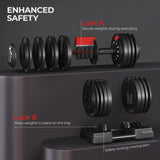 - 🏋️♂️Dual Safety Lock Mechanism: For heightened stability, balance, and safety during workouts, this adjustable dumbbell boasts a two-step weight plate locking mechanism. Weight adjustment is activated only when the weight set is securely on the tray, minimizing the risk of accidental operation.